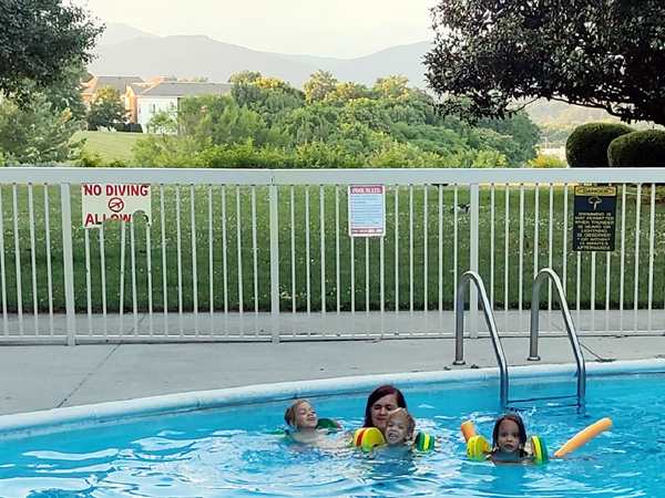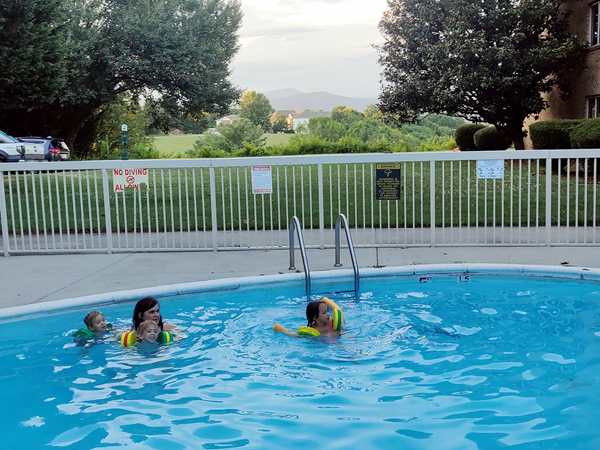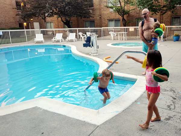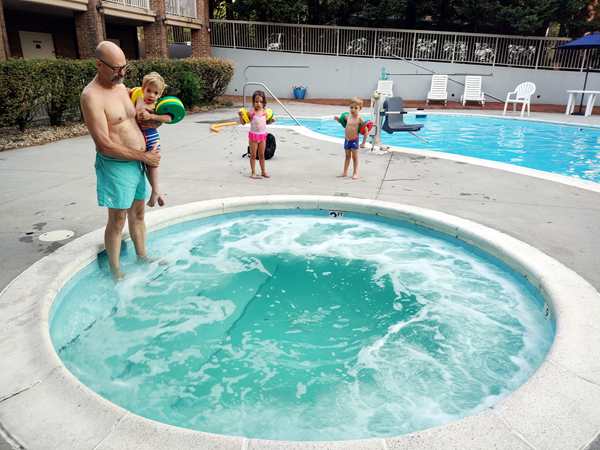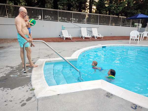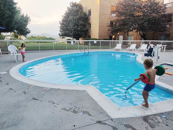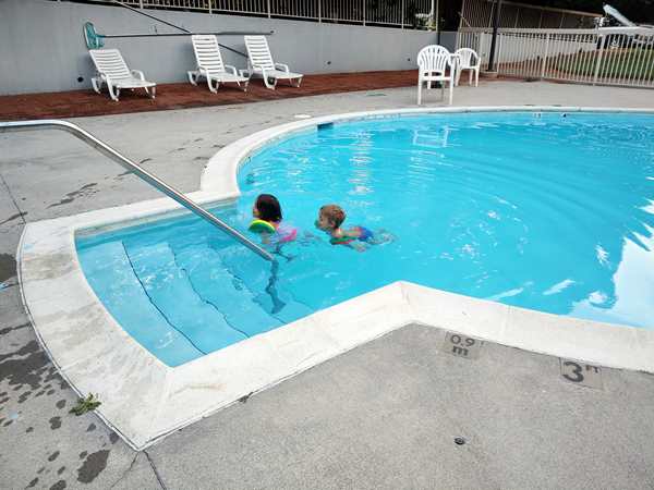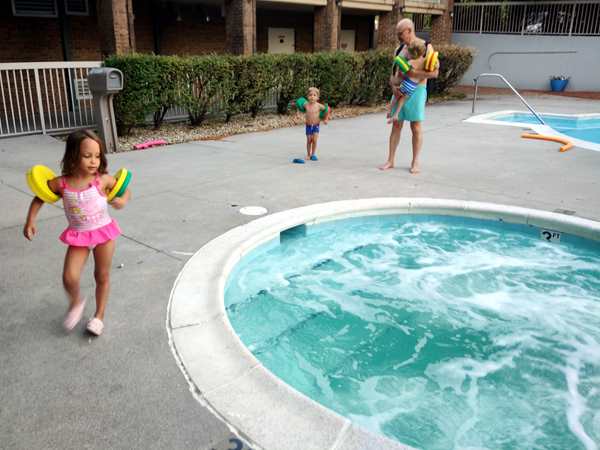 It was just after 7 pm and by 7:30 pm we finally reached the hotel. They were ready to get out! We checked in and went to our room, where I waited with the kids for Randy to bring all our stuff inside. They had some salami and tortillas, then we put their bathing suits on and walked to the outside pool they had.