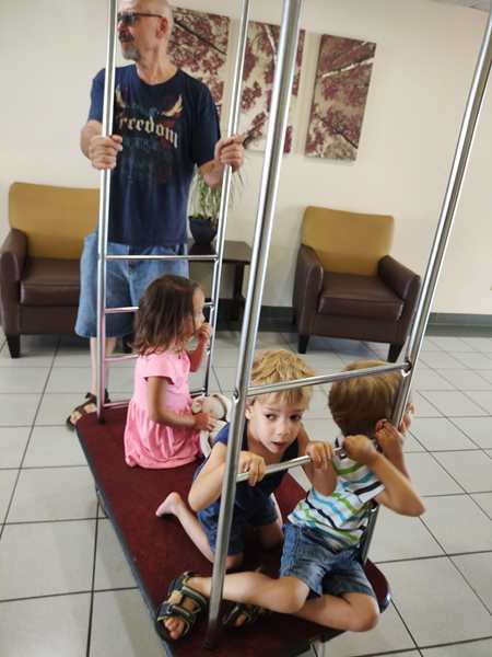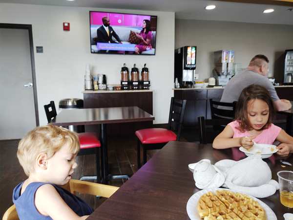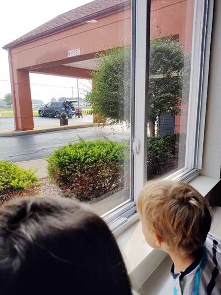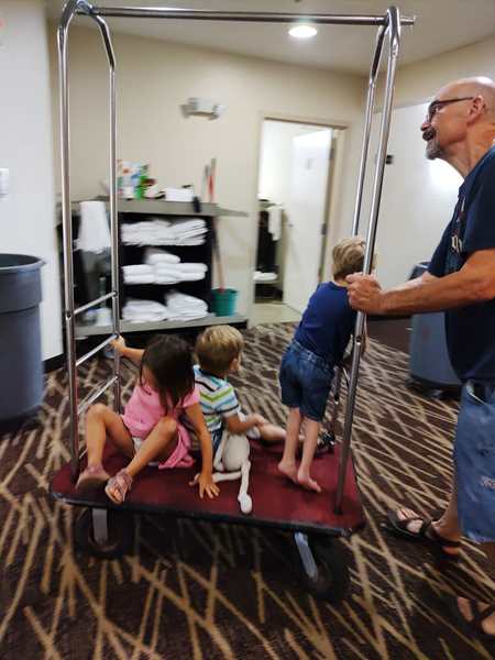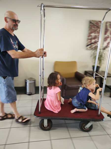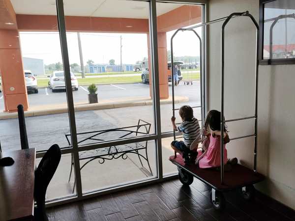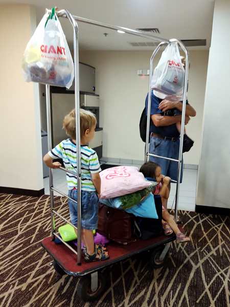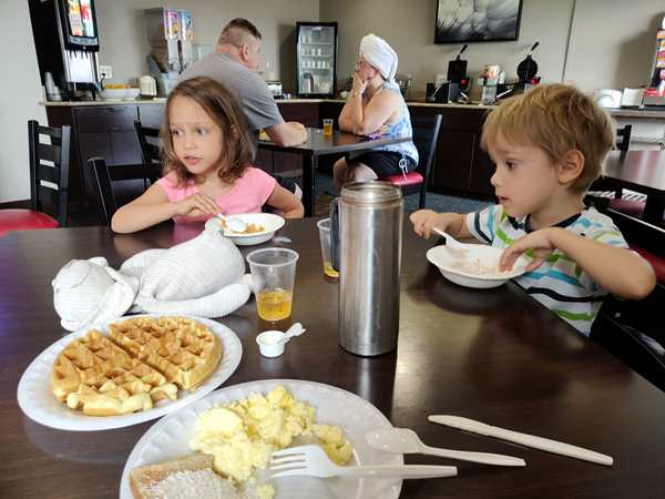 Day 1429. It was close to 2 am, when I joined Randy and Emmy in a double bed, so it was tight. Just before 8 am my alarm went off. We got the kids dressed, then Randy left with them just before 8:30 to go have breakfast. At 8:30 I started teaching a lesson. At 9 am they returned, 20 minutes before I was done teaching, so it became a little more challenging, as the kids kept coming to me. After I was done teaching, I finished putting everything into our suitcases, then I left with the kids to go to breakfast, while Randy started loading the car up. Of course the kids had already eaten, but they were interested in trying the Cornflakes that they had never had before. While we were eating, they could see Daddy loading the car up outside. Once I was done eating, we all walked that direction, then they got on the cart and Daddy pushed them all the way to our room, where we collected the very last items. After everything was in the car, we strapped them in, and then we finally drove off. It was already just after 10:30 am.