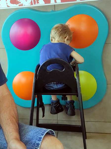 We ended up having a wonderful time of catching up and reconnecting, and he also did great with the kids. As for the kids, the playground was really great, but really high, and especially Emmy was really scared to climb up, Even Tammy had some fear, so there was quite a bit of screaming, as Emmy wanted attention and help. As usual they did not eat very much. There was a board on the wall with big half-balls that made noises and lit up, which was the perfect toy for Sammy - for a while.