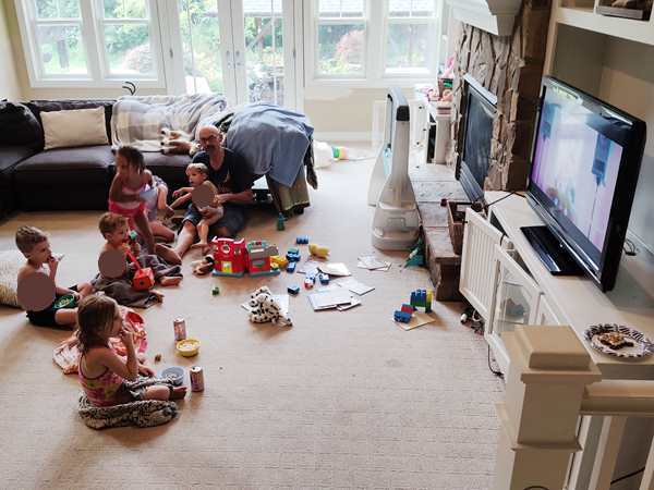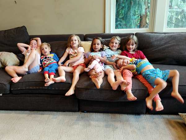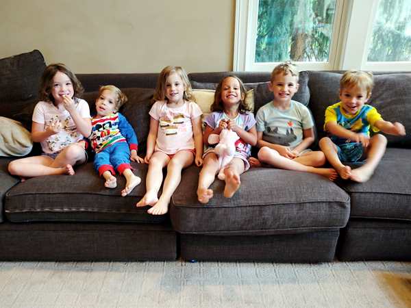 After our suitcases were brought in, we put their swimsuits on the kids right away, as they were eager to go into the small stand-alone pool outside. The water was a little cold, but they didn't mind. They were having lots of fun. Sammy did not stay in it very long because of it being cold. Randy then ended up staying outside with the kids and their Dad, while I ended up in the kitchen with the Mom and Grandma. I had the greatest time talking with them both; it was really a blessing. And we got to do that for quite a long time. Then Grandma said good-bye. By then everyone had eaten, and the kids had come inside and were watching a movie and eating popcorn. But not for long, as there were toys, and then they started playing together with lots of energy. They had all bonded immediately, the two sets of triplets plus another sibling of theirs who was two years older than their triplets. It was great to watch them have so much fun. We wanted to take a picture of the triplets times two, and so we did. Neither ours nor theirs had ever met other triplets before.