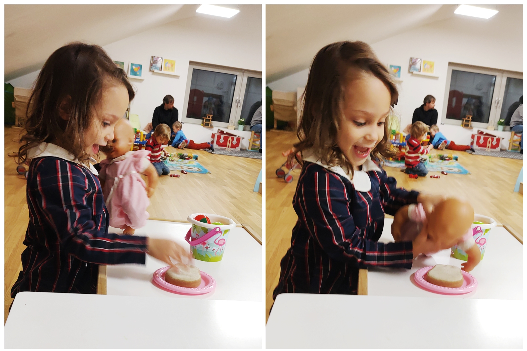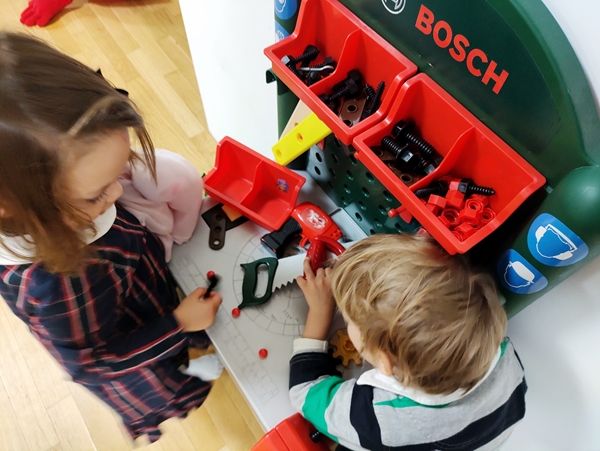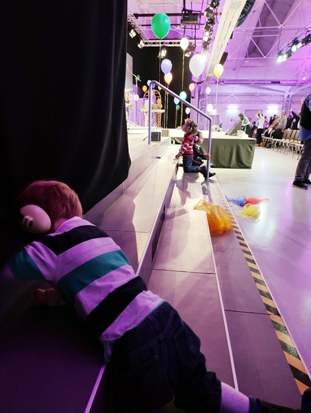 All our three kids ate very little, as they wanted to go play. Sammy wanted to return to the kitchen, so I took him there. Then he wanted to play at the workbench, and the other two also came by there. Emmy also played being Kasperl as there was a theater frame for it, and Tammy was dressing the dolls in princess clothes and put a crown on herself. Then Randy returned, and we put their shoes on to go back down to the sanctuary.