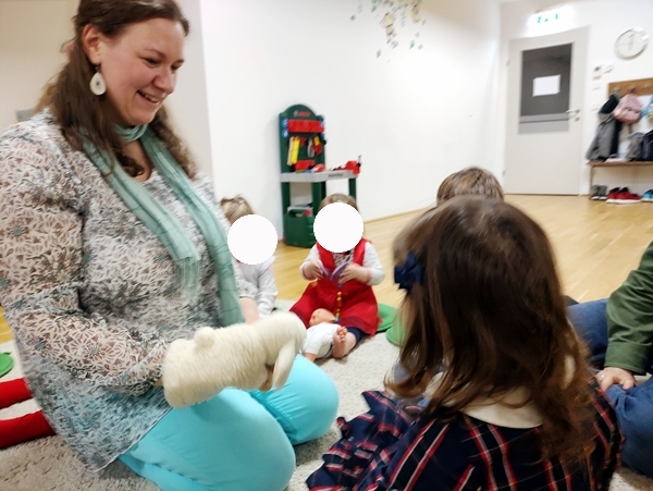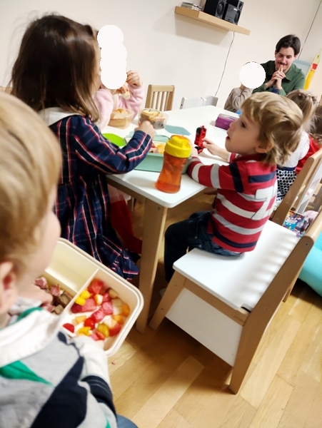 Then it was already 6 pm and time for the program. Sammy was not happy at all, when I pulled him away from the kitchen, and he stayed unhappy during the program, which has never happened before. We started with the general greeting song with actions, then the teacher did individual greeting songs for the kids, where they get to cuddle the hand puppet sheep. Then they got Bibles, and we did the Bible song, where they lift their Bibles high up into the air. Then the teacher started her teaching on God/Jesus being the winner, and us with him. The program wasn't long and ended with everyone holding hands and the teacher speaking a prayer. Then everyone sat down to eat.