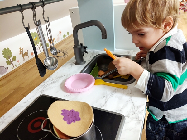 We were not the first ones there. Randy returned to the sanctuary, while the kids ran to start playing. Sammy wanted to play with the play kitchen, of course, so I sat down with him there to make sure he wasn't falling. Tammy got a doll and started feeding it, while Emmy was playing with cars.