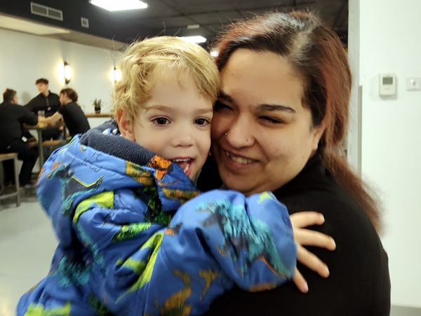 Sammy was calling out for Anna, as usual. She'd been gone for a few weeks, so he hadn't seen her in a while, but today she was there. He was so very excited to see her and really clung to her, hugging her tight. She showed us that he was hanging on her neck without her holding him. He did not want to leave her, but it was time to go. The service was still in full swing showing no sign of ending, and so we put their coats on to go home and left, hoping to catch the 7:30 train.