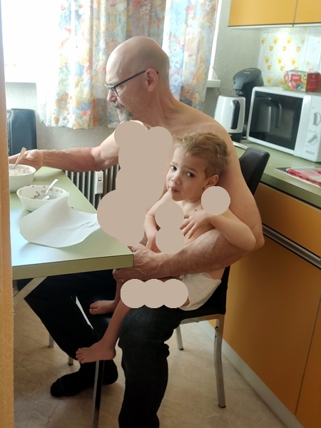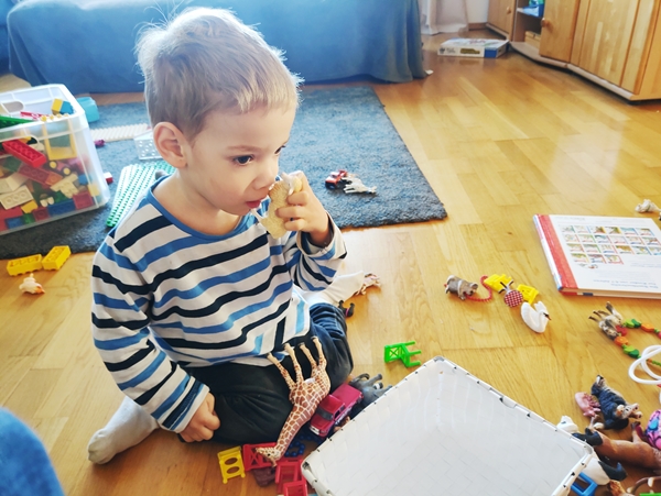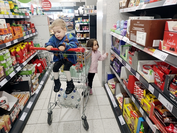 Day 1298. It was 5:30, when Emmy asked to listen to stories on his headset. When I saw what time it was, I asked him to come back to bed and sleep. He started having a fit and crying really loud. Thankfully he did not wake anybody else up and finally lay down next to me and fell back asleep. By 7 am he was up for good and soon he had woken up his siblings as well. Eventually we all got up. Randy made his oatmeal and sat down with Sammy at the tiny table in the kitchen, while Tammy and Emmy sat on the bar stools in our bedroom to eat. Then I cleaned them up and dressed them, and we all left the apartment to go to the grocery store around the corner.