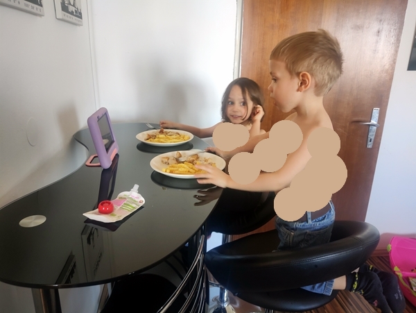 With noon approaching, I put fried chicken and fries into the oven to bake. I portioned it out on all the plates, but the chicken turned out not to be good at all. After lunch, they watched some more until 1:15, their bed time. I then put them to bed. Since Tammy and Emmy sleep with us at night in this place, I had one to my left and one to my right, as we all lay down together. Soon we were all asleep. Sammy had barely eaten lunch because he was so tired and fell asleep half an hour before his siblings went to bed.