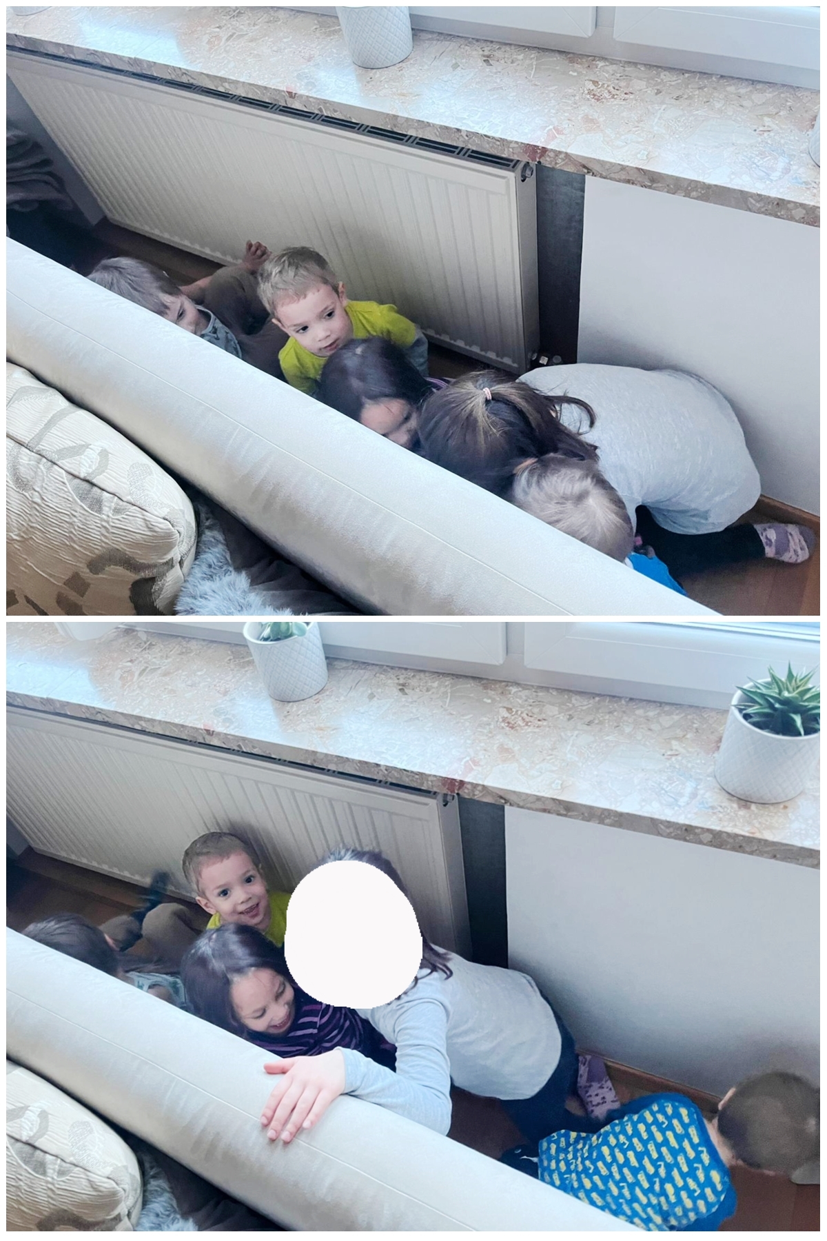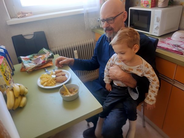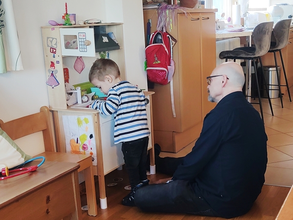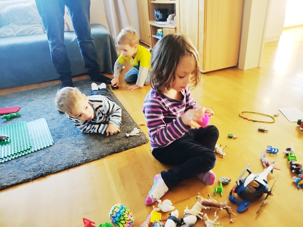 Just inside there was the cat sitting and sleeping. All our kids petted the cat who did not mind. Then we went all the way inside, where we had some cake. The kids did not stay at the table as there were too many toys to play with, and they were having fun. One of my friend's kids was older and her other one younger than our kids. Tammy then started reading books, while Emmy had the Dad of the house read to him. Sammy got to play in the toy kitchen, as did the others. Once our friend's youngest foster daughter arrived who is two years older than our kids, the fun level went up even higher. Tammy had found another girl friend and had just so much fun with her; they all did. We adults stayed at the dining room table for most of the time, talking with each other as much as was possible. I was still so extremely tired and had no appetite to eat anything.