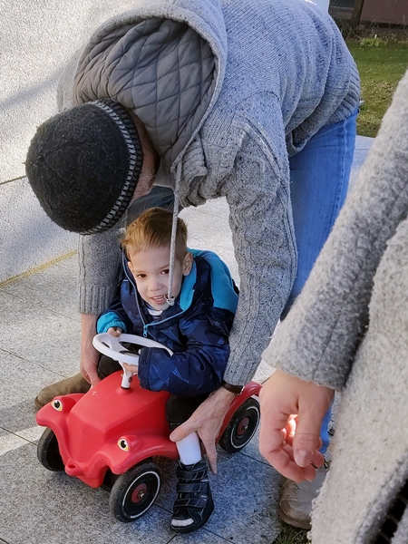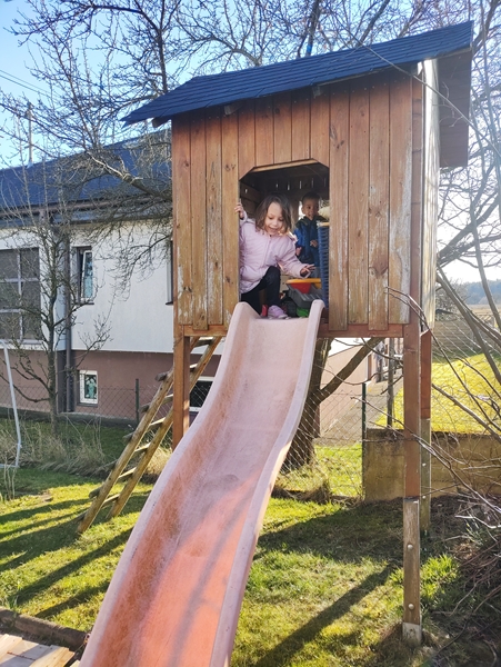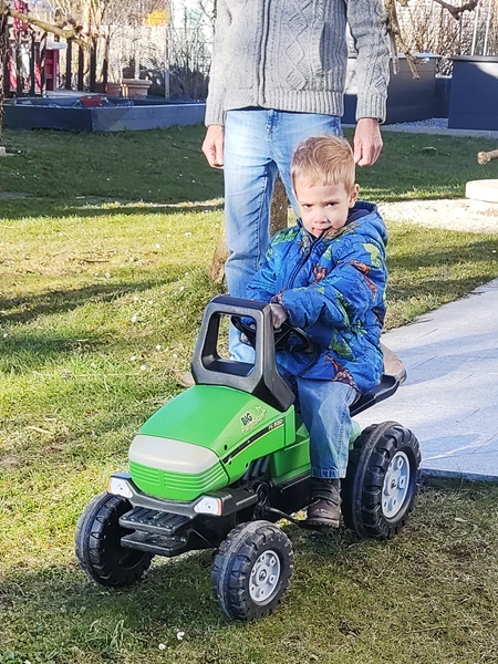 Even though it was a cold day, we stayed outside at first so the kids could enjoy all the fun stuff they had in their garden. First they went onto the trampolin, but didn't stay long. Then they went up and down the slide. Then Tammy went to the swing, while Emmy found a tractor he could sit on and petal. Sammy also got to sit on and ride a car. He started saying that he was cold, so we went inside.