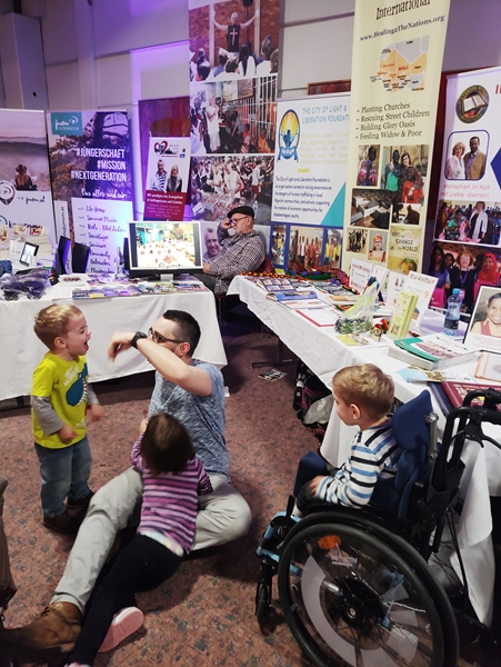 Just after 6 pm we had to say our good-byes. We put the kids back into the car and left drive to the church, where the conference was starting tonight. We got there at 6:45, but only found parking a little away. Unfortunately I don't have that handicapped sign yet that you put into the car so that you can park in handicapped spaces. It would have been convenient to park right next to the entrance of the church. Randy got Sammy's wheelchair out, put the wheel back on, and we put Sammy into it. We got all the stuff for our table and started walking towards the church. Once there, we got our name tags and looked to find where we had our table. Most other missions had already finished setting up their tables. We started getting our stuff out, when a guy approached us and offered to help. He started playing with the kids who were having the greatest time with him. I was thankful the kids were occupied so that I could set up the table.