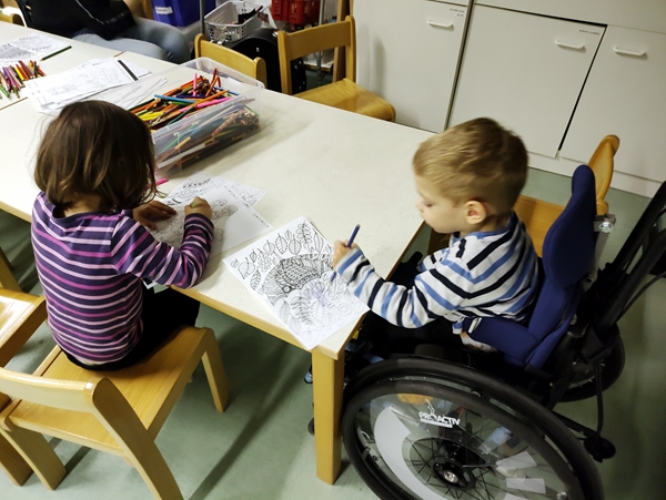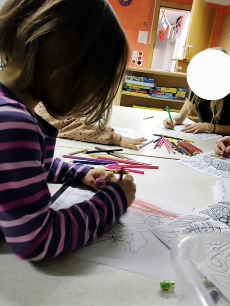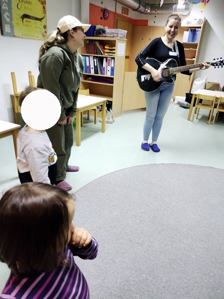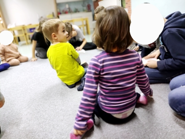 It was for kids 3 years and up, and there was a good number of kids already there. Our kids joined a little group in the corner who was playing with blocks. I then left Randy there with the kids and returned to the sanctuary. I was enjoying worship, but not for long, when Randy texted, asking for the diaper bag, so I left to take it to him. He took Sammy to change him, while I encouraged the other two to participate in the program. There was some worship, songs with actions, that our kids did not know. Then we sat down and they distributed Bibles to those who can read. Emmy took one. The lady showed him, where the passage was, and after one kid had read, he pretended to read and said, "Once upon a time there was a wolf in the woods." It was hilarious.