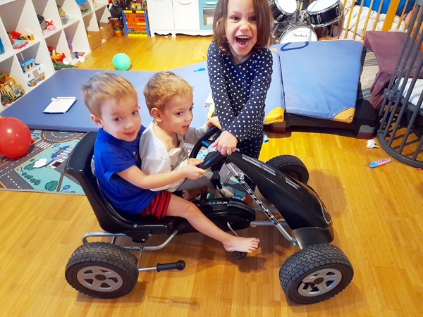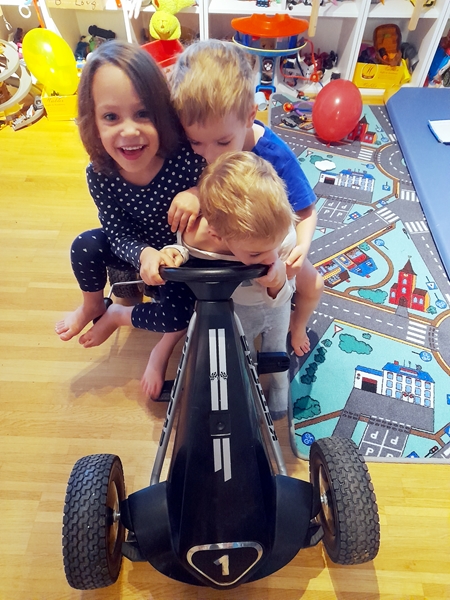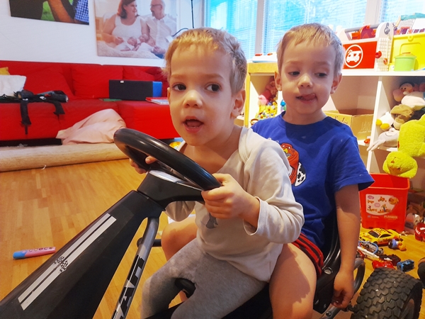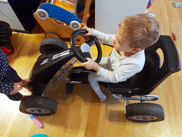 Randy went downstairs with the kids at some point. He got the gokart out he'd bought second hand a few days ago to let them check it out, and all three loved it. In the end it was Sammy who was still on it, and Randy said he loved it more than anything else before. When he took him off to come upstairs with him, he was extremely upset, crying, and he always scratches and bites, when he's like that. I took him from Randy and was able to calm him down. We then got everyone and everything ready to leave, and left the house around 4:20 pm.