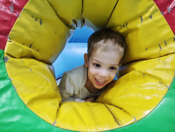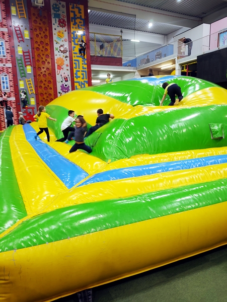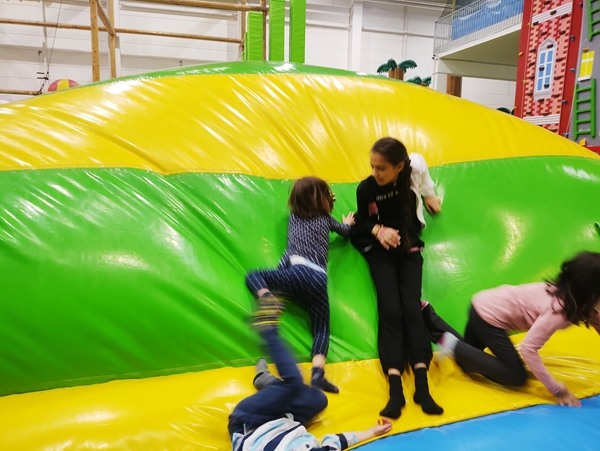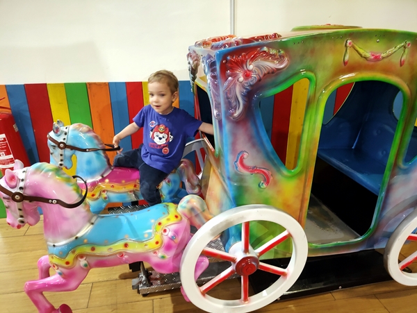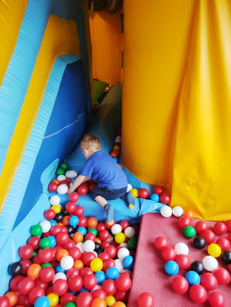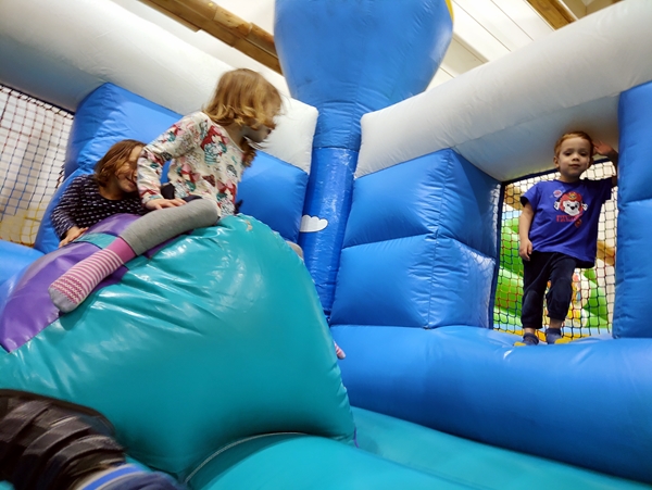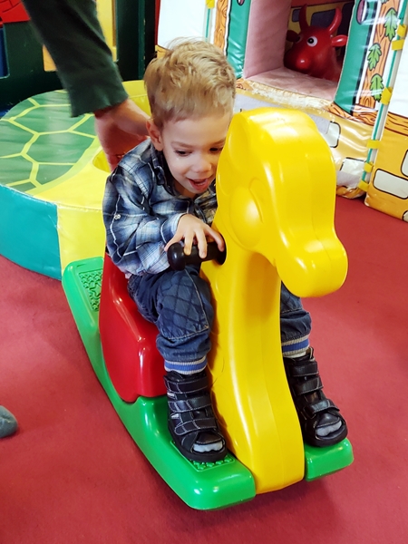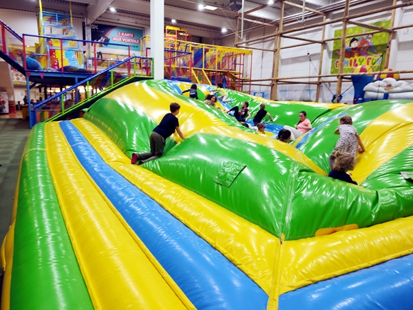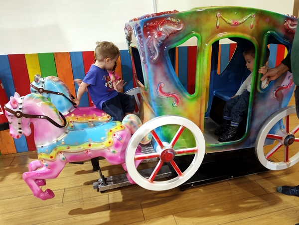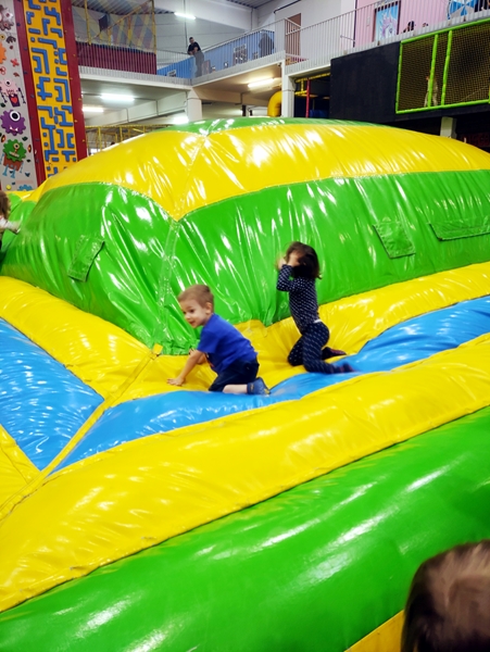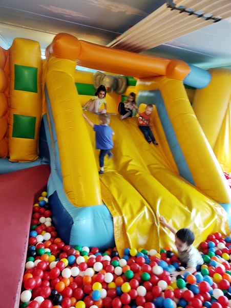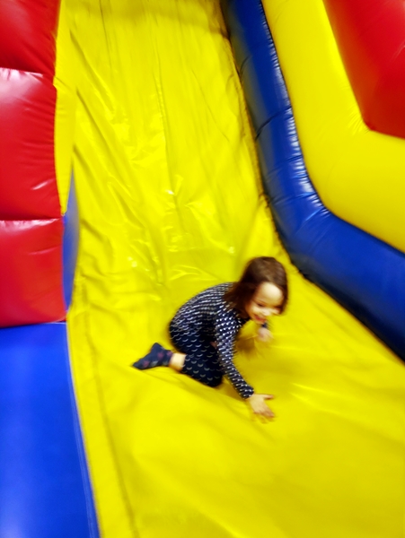 It became tricky after that, as it was impossible to always know where everyone was. The girls started going down the big slide and climbing back up several times, and Emmy did too. I then climbed up with Sammy and went down with him, which he really enjoyed. Randy also slid down with him once. Then we moved on to another construct with a long slide there, and Emmy went down and climbed back up. He and Sammy also went inside the carriage there, and Emmy was sitting on the horse. At that point we did not know where Tammy was, so I went downstairs to the bottom, where the slide ended and found the Grandma, who didn't know where they were either. Soon I found Tammy on top of the blow-up mountain. Randy and the boys then came downstairs as well.