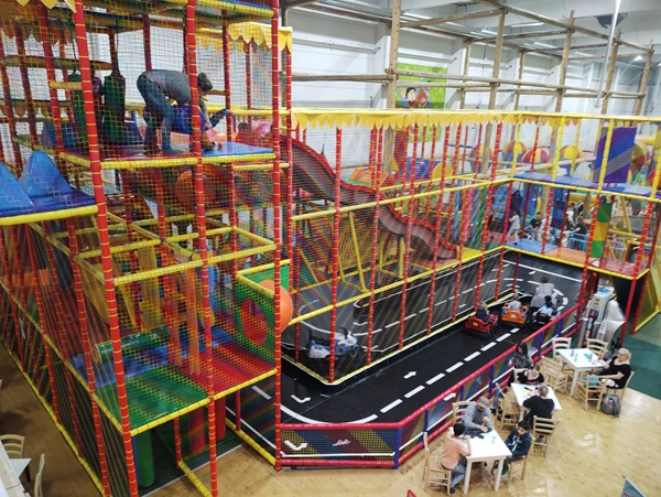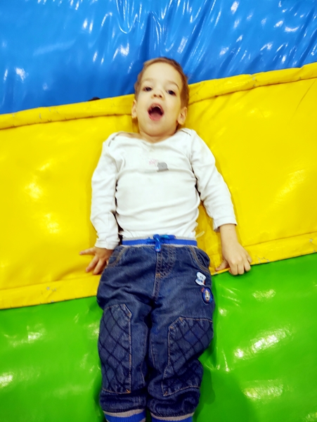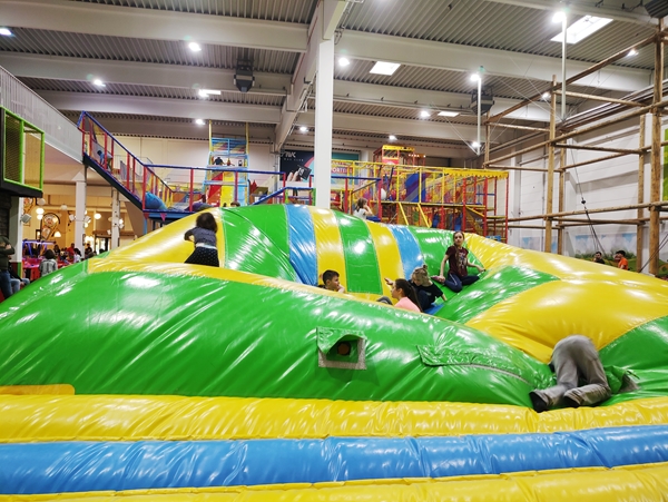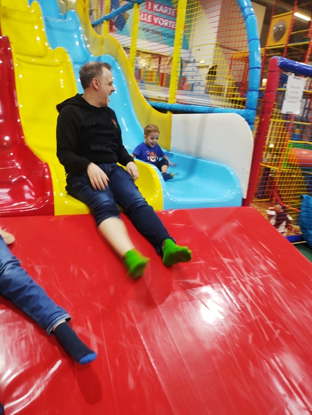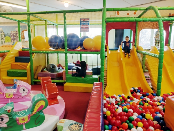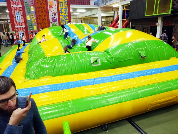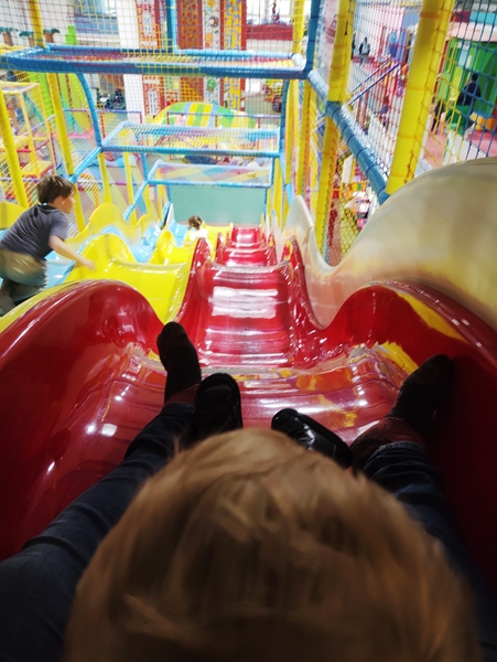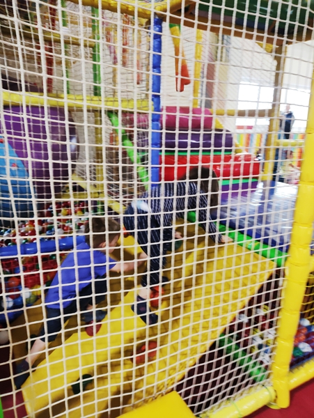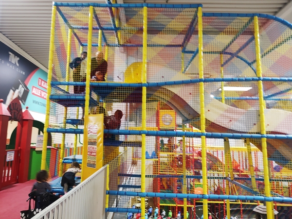 We rode the bus for a while, and then we still had a good walk ahead of us to the indoor playground. The kids had only been there once before, which was over a year ago. We walked and walked and reached the building 9 minutes before 5 pm. There was a long line of people that we joined - all the people that came for the reduced price that becomes available at 5 pm, to stay for the last two hours of the day. At 5 pm the line started moving. When it was our turn, I was happy that Sammy got to go in free, as it was still rather expensive.