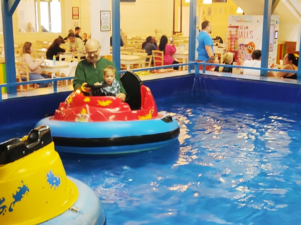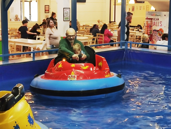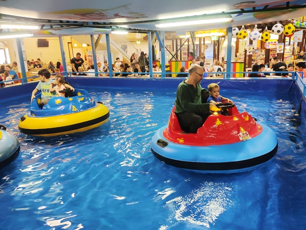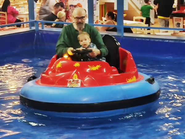 We took our coats and shoes off and left them in a locker, then we went in. Tammy and Emmy ran straight to the huge blow-up mountain in the middle of the room and started climbing up. The air would increase and decrease so that the kids could climb up on the lower air. The pool with the boats was right there, so the rest of us lined up there. I had bought 3 extra coins for the boat ride, as they had loved it so much last time. Emmy was the first one to get into the boat with Emmy, then Sammy took Emmy's place. Tammy was supposed to go next, but she didn't care to go, and so by the time we wanted to use the last coin, all those activities were already closed for the day.