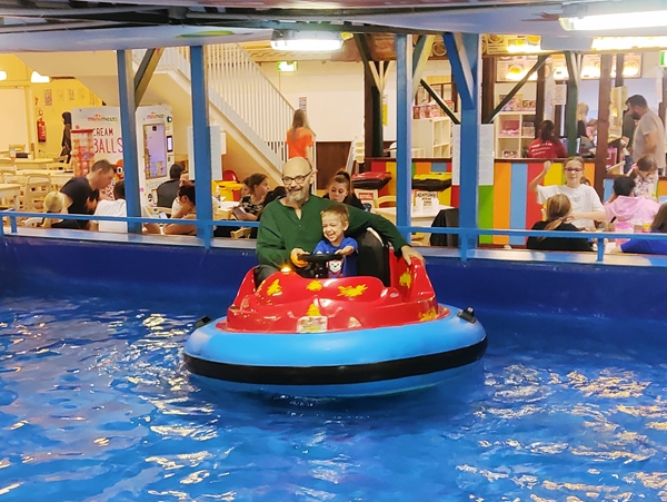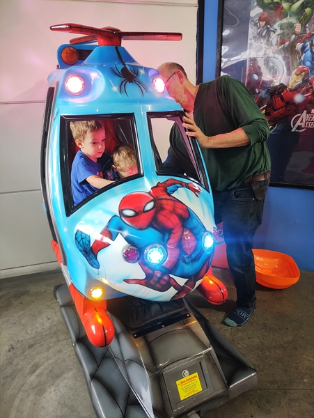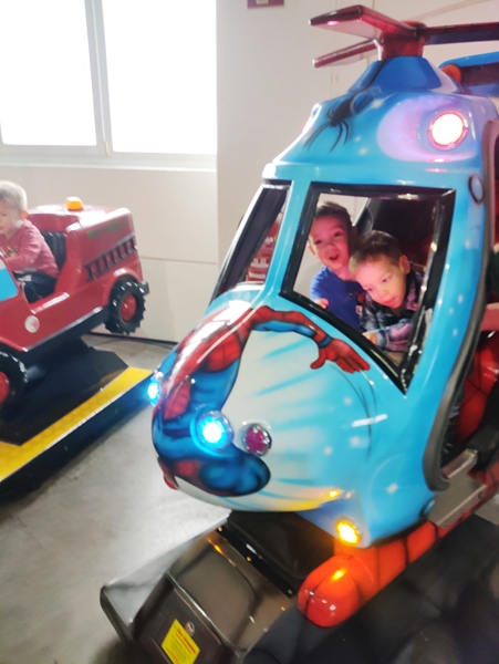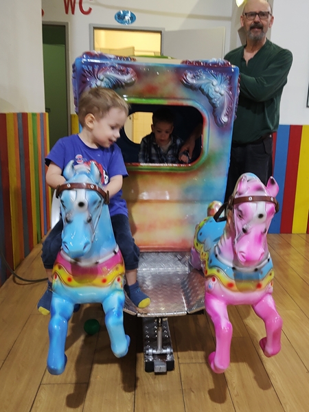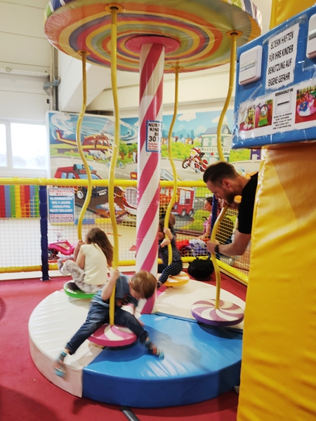 After a while I suggested we go on to the trampolins that were nearby. Tammy was not happy, as her friend was going a different direction, but she soon returned, as the girls wanted to stay together. The boys got into cars and a helicopter, and Daddy made the helicopter move by putting a Euro in. They were also all jumping around the trampolins for a bit. Then we all moved on again.