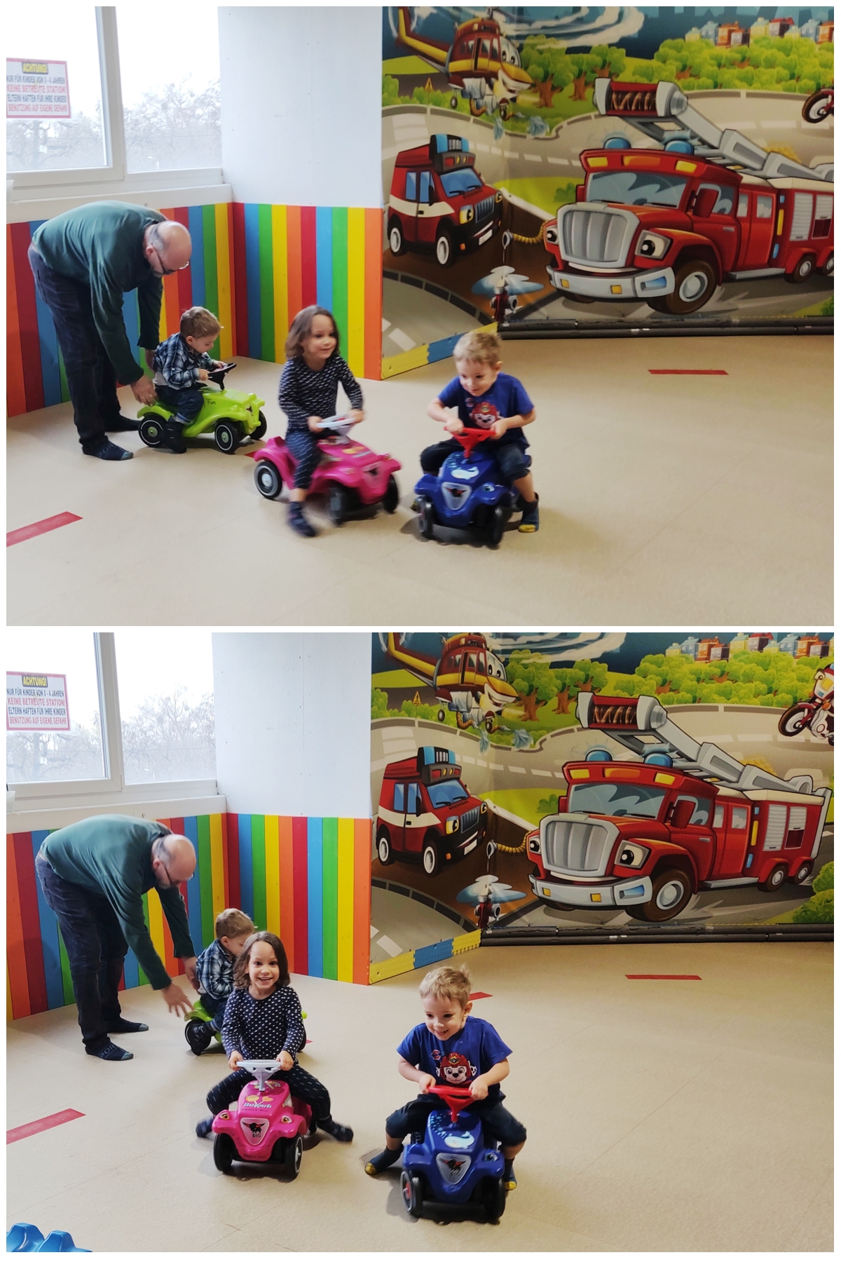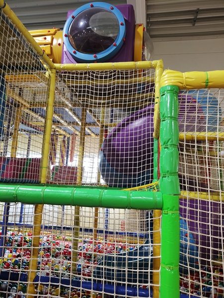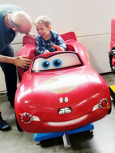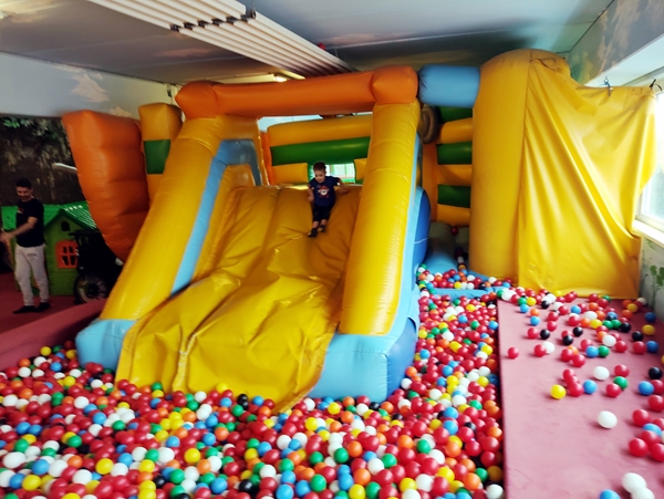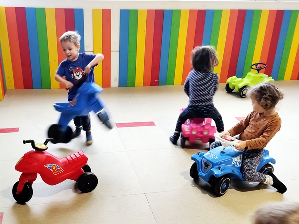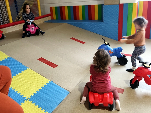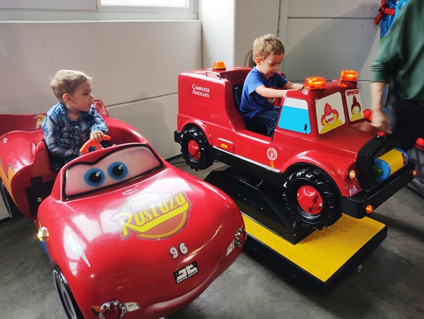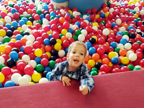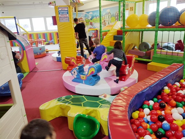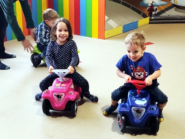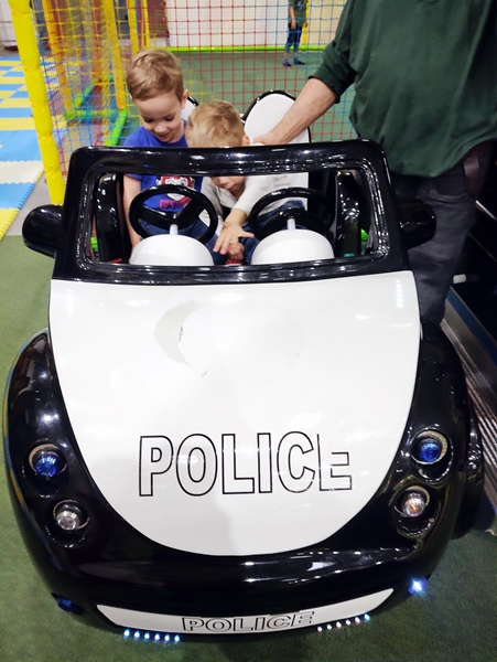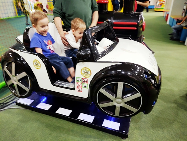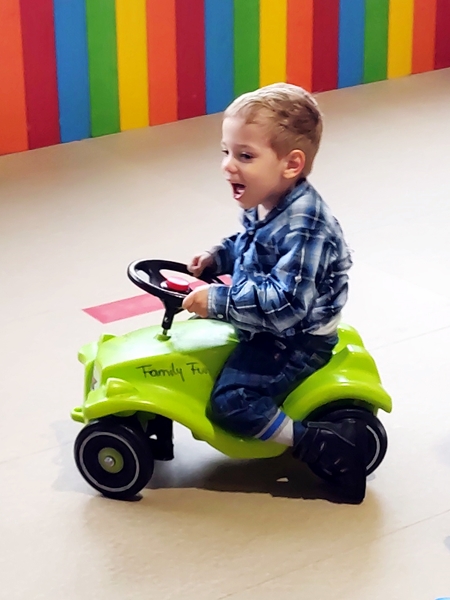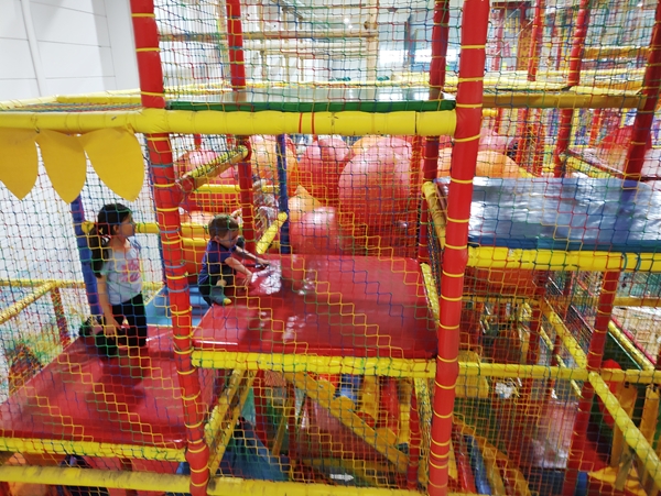 After the boat ride, we took the elevator up to the top floor, where the area for the 0 to 4 year-olds was. Sammy loves his balls, so we went to the pool of balls first, but for some reason he didn't like it, so Randy took him elsewhere. Tammy and Emmy didn't stay long either and moved on to other things quickly. There was a smaller pool of balls as well that had slides going in, and they went down those slides a few times. There were some carrousel-like things as well that they did briefly, until reaching the "racing track", the area for the little bobby cars. All three started going around there, with the hill being especially appealing. Sammy stayed there much longer with Randy, enjoying moving around all by himself with the car, able to make it move. As for the other two, I showed them the long slide ending in balls right next to there, so they started climbing up and sliding down there. Tammy made a new friend there, a girl who was a year older than her, and the two stuck together for the rest of our time there. I was talking to her grandmother, while we were both standing there and watching them.