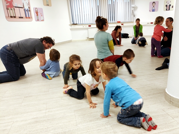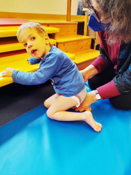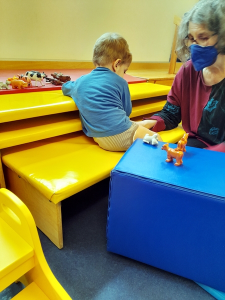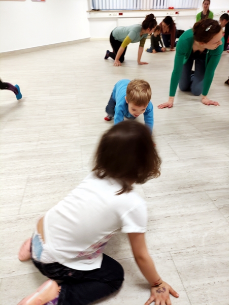 The teacher had everyone imitate animals again, and she had them try different ways of walking, from toes to heals to the inside and outside of their feet. She also had everyone sit on the floor and stretch a little. Before we knew it, it was already time for the final song, the one you can't get out of your ears. Sammy was back in his wheelchair at that point, and so I walked with him, as it was a walking song where we periodically changed direction. Then it was time to put coats and shoes back on and to go home.