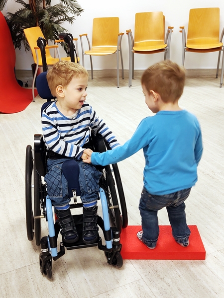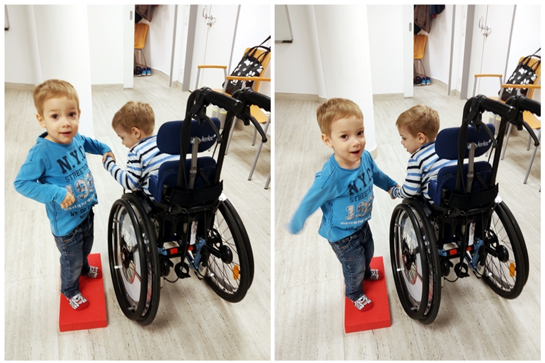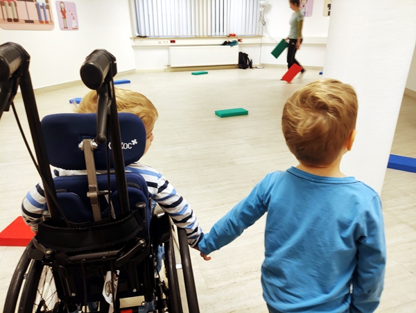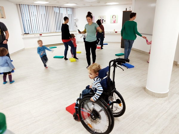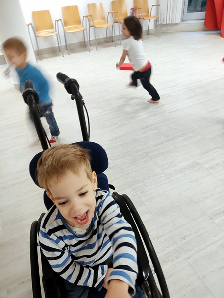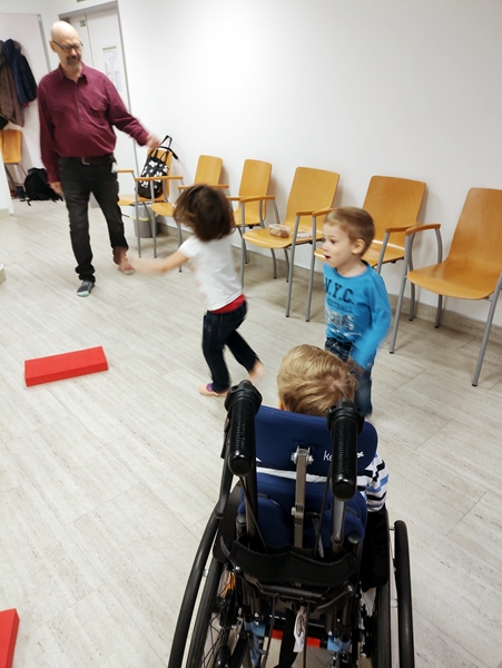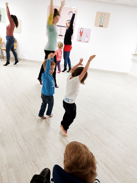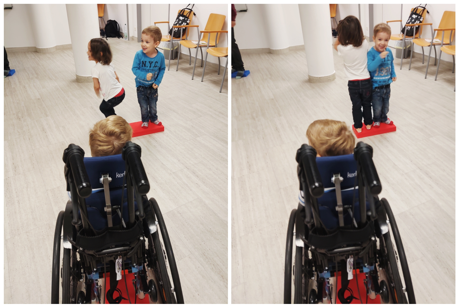 The teacher started the same way as always, with a song everyone had to dance to and then freeze, when the music stopped. She put blocks on the floor that the kids had to stand on, when the music stopped. I was dancing with Sammy whose wheelchair I pushed over a block, which worked out perfectly.