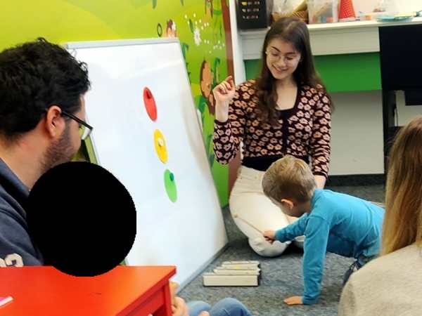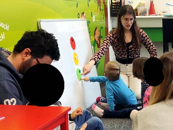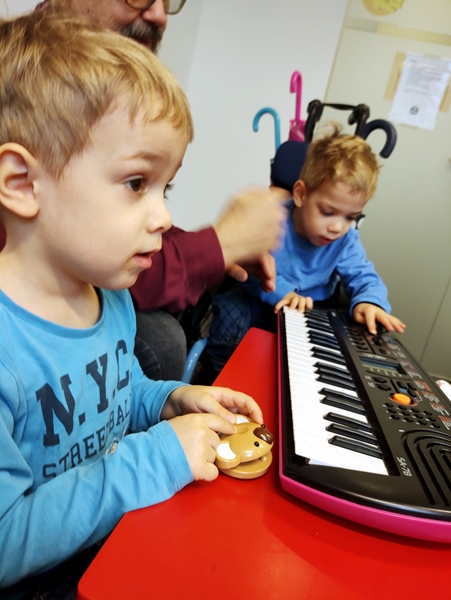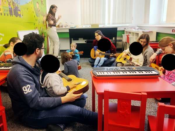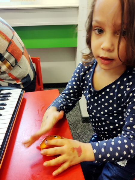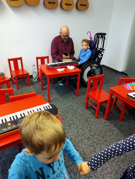 Then it was time for them to sit down by the pianos. I sat between them to help. They got to choose a finger puppet, then she did the song to learn the numbers each finger represents. They put the puppet on finger 1, then 2, etc. Then they returned the puppets and got the little animal that makes a clicking sound. Now they had to tap the animal with finger 1, then 2, etc. They get better and better at it. They returned the animals, and everyone went up front, and so did I. We made a circle, and the teacher went to the piano to do a song. The kids had to put certain body parts into the middle and out of the middle. It was to review that the left hand/leg is the lion hand/leg, and the right one the mouse hand/leg. After the song, they sat down on the floor, while I returned to the back of the room. They all drew different notes on the board and then wiped them off. Then the teacher gave each child a guitar to play, while she was doing a song on the piano. Unfortunately there was no guitar left to give to Sammy. But Sammy was having fun with me. After they had played the guitars, it was already time for the good-bye song, and then the class was over. They each got a sticker in their sticker books, then it was time to put shoes and coats back on to go home.