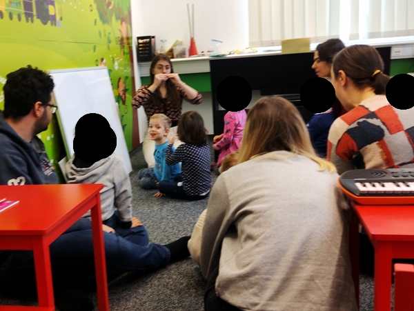 We took the train and then the subway and then still had a long walk in the rain which was not much fun. We got to the school over 10 minutes before the class was to start at 10:30. As I had not had time to grab anything to eat before leaving the house, I went to a nearby grocery store by myself to buy a sandwich. When I returned to the music school, the teacher was just finishing the welcoming song, and the kids were all going to the front to sit down on the floor. I sat down by Randy and Sammy.