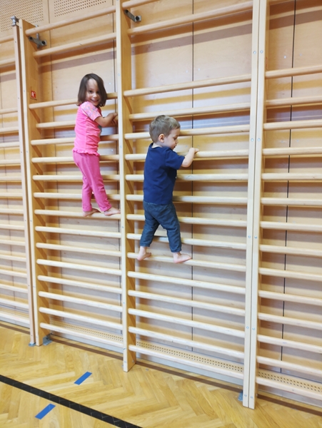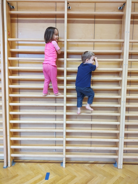 In any case, the kids were excited to be in the gym and started running and climbing up the walls. Tammy climbed all the way to the top and was proud to show that she could do that. Emmy was still a little fearful, as he does not like heights.