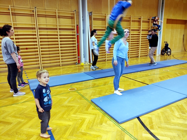 At 6 pm the teacher and other participants came in. In fact, there were a lot of people today. He started handing out hoops to begin with the typical race of the kids inside the hoop and the parents holding the hoops. Three times we ran to the other end of the gym and back. Randy ran with Emmy and Tammy, and I pushed Sammy in his chair. Then it was time for them to lie down on the ground, and we pulled the kids who were holding on to the hoops. Sammy just loves that part. We did that a few times as well. Then the teacher handed out balls to everyone, and the kids started running and chasing and trying to hit us with the balls. I was playing balls with Sammy for a while. He then also wanted to climb up the wall, and he did really well. He lifted his left leg up to the next sprung, then had a little bit of a hard time putting his right leg on the same sprung. But he was motivated to go up, and upset, when I got him down. Then I left with him to change his diaper.