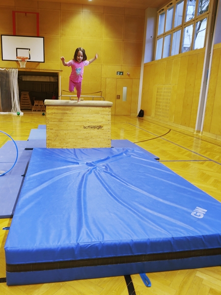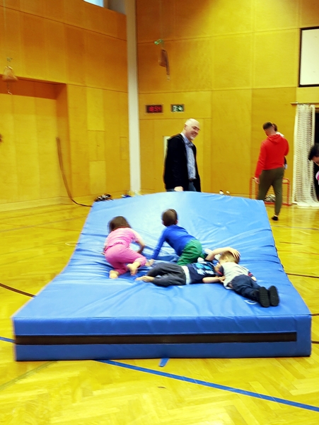 When we got back, all the equipment was set up. Tammy and Emmy were walking up the bench to jump of the vaulting box, and today Emmy was not scared of the height for some reason. The rings were also down, and our kids lined up to get on them. All three got to swing and had fun, Sammy being very upset again, when I pulled him out. He was trying to bite and scratch me in his anger. I then suggested to the teacher to have a second set of rings, so the kids did not have to line up for so long, and he got them down. From then the wait times were short, and the kids were loving it.