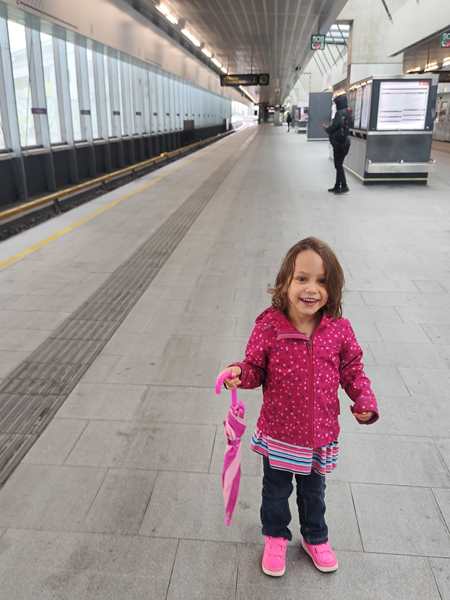 When I finished at 4:20 pm, we needed to leave the house immediately. I had forgotten to ask Tammy, whether she needed to go to the bathroom, as it's only been a few weeks that they don't wear diapers any more during the day. As a result she had wetted her bed while sleeping. She got a change of clothes, and we quickly left the house to walk to the train station.