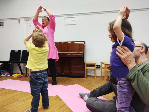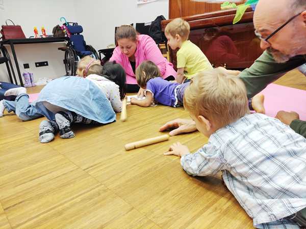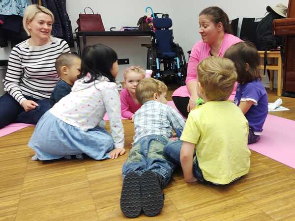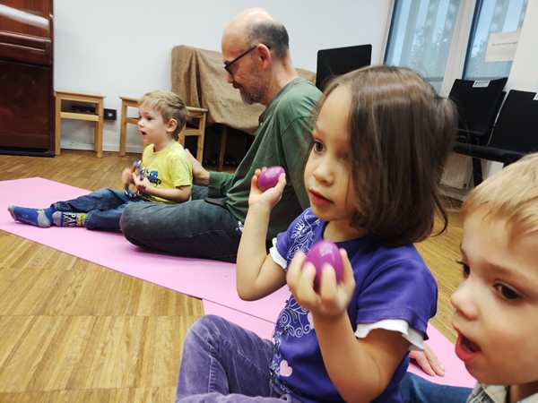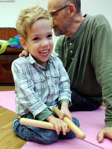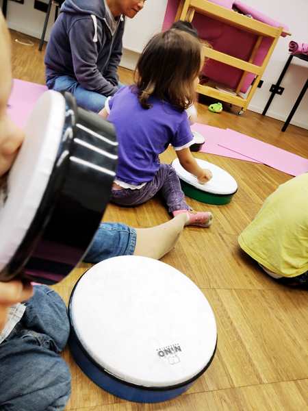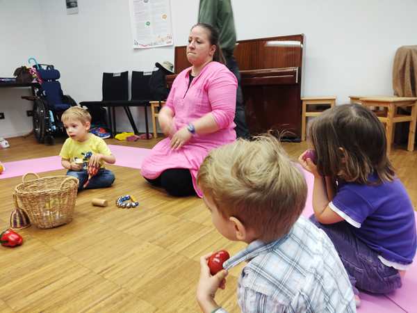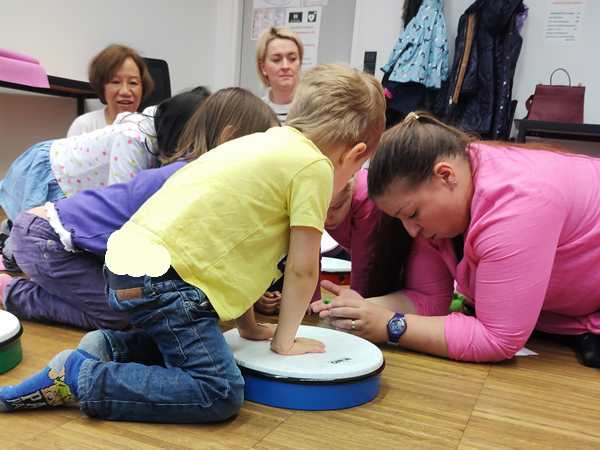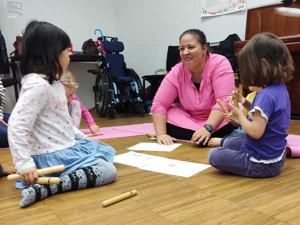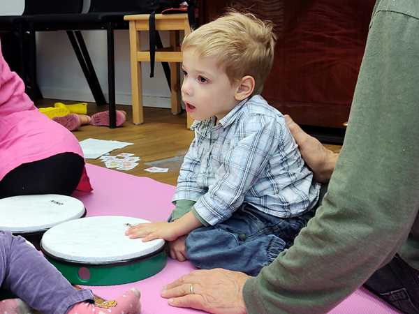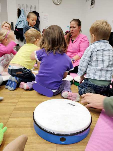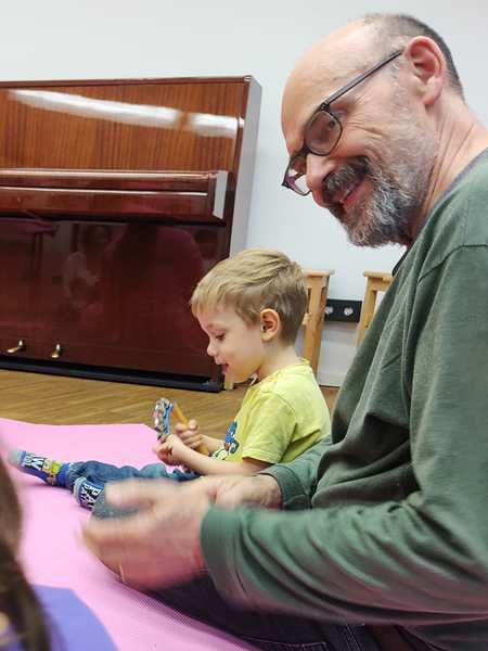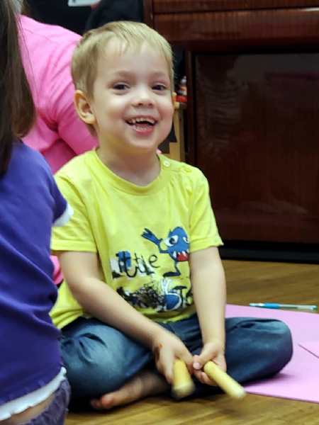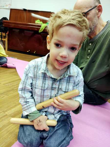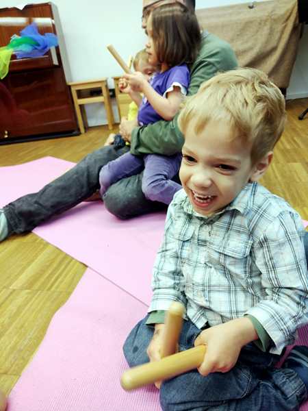 The class was just starting, and there was another girl and a brother and sister there. The kids all got some rattles, then the teacher did the greeting song, going from child to child. Every child got to say what they wanted everyone to do during their song, which was mostly sing. Then she did an action song. I had Sammy, moving his arms and body to do the actions; the other two actually did them without being told to.