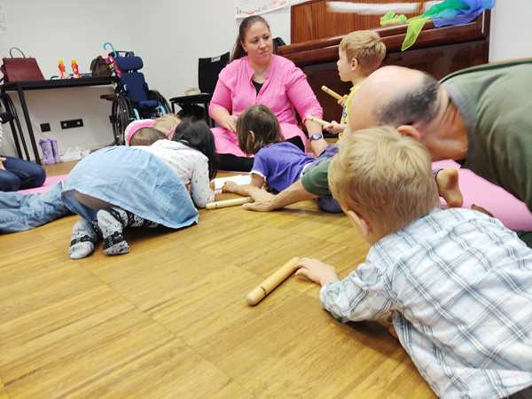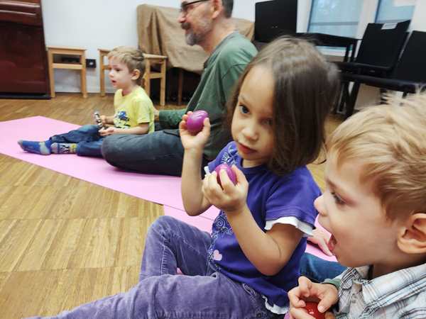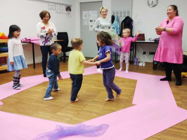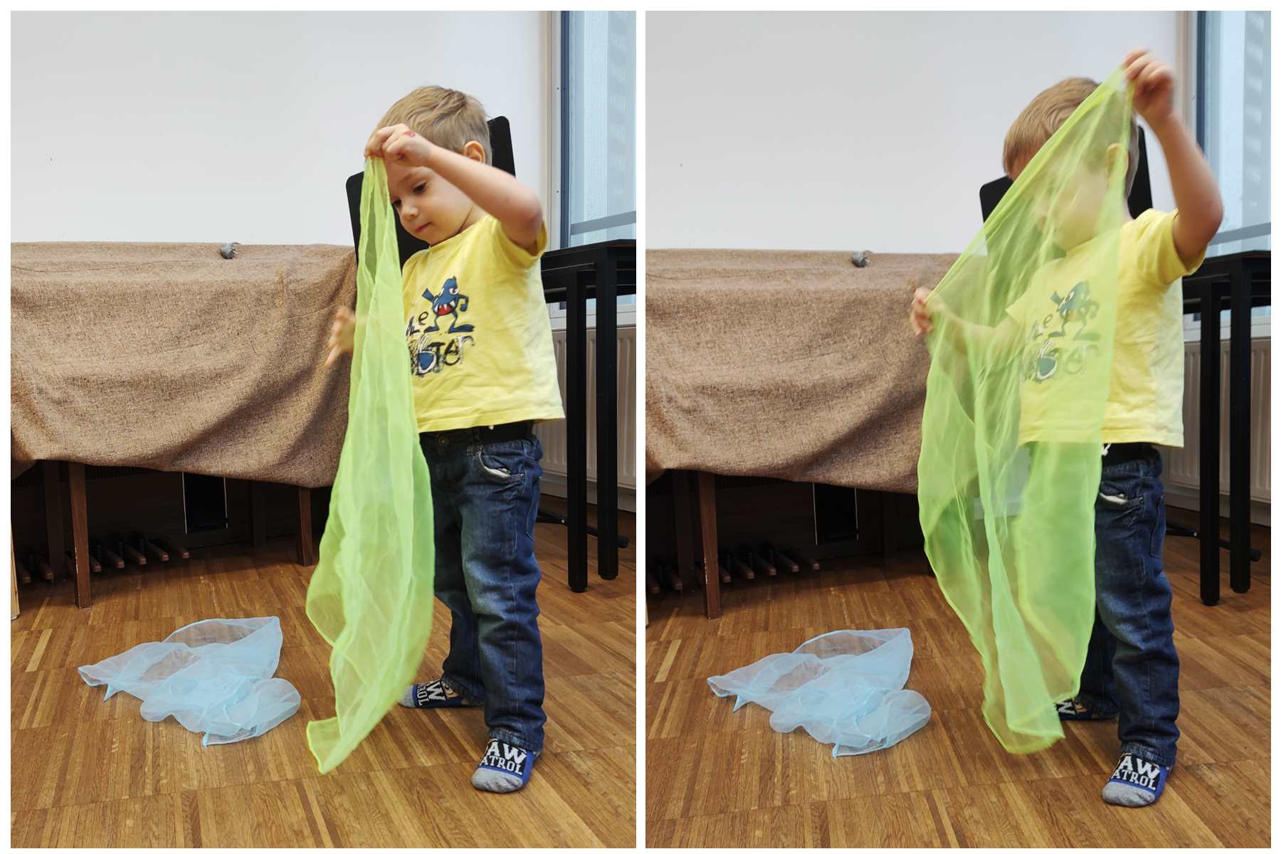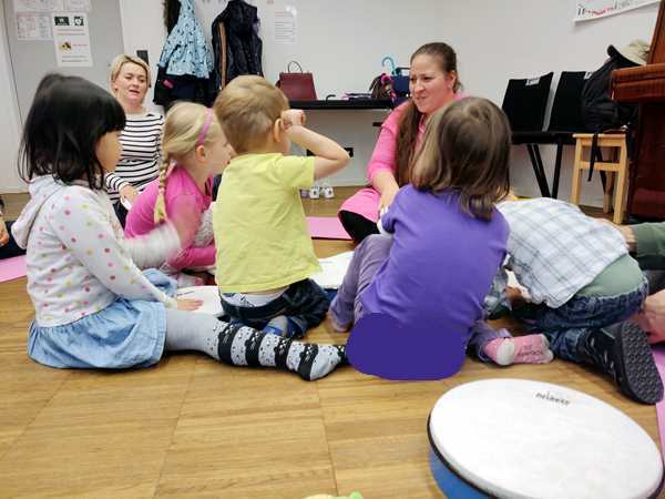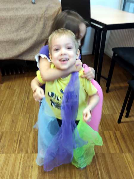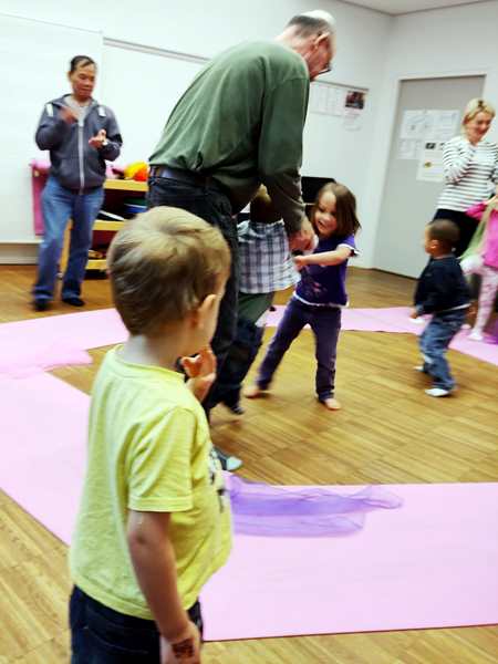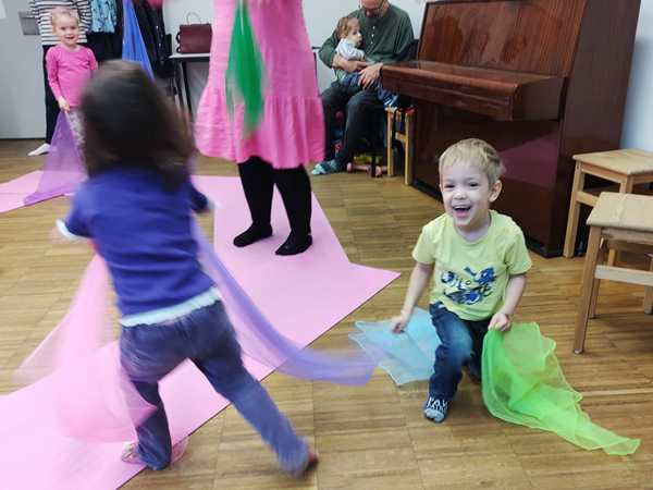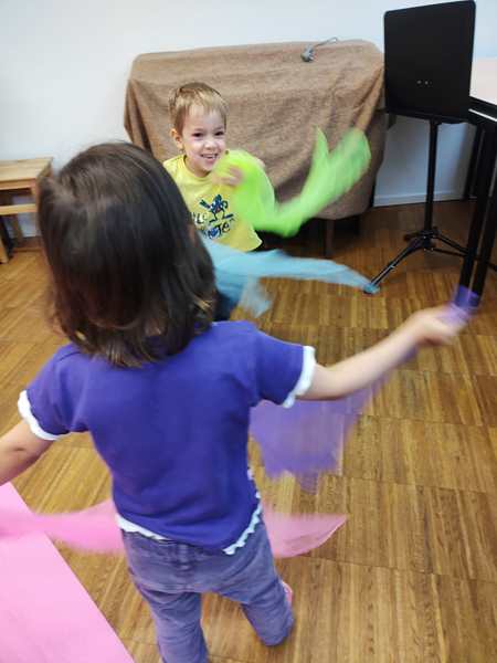 Then the kids all got drums, and she got a caterpillar out and told a story with it, while the kids got to drum at certain times. Then she drew notes on a paper and had the kids drum as often as there were notes. Then she did the butterly song. Each kid got two pieces of fabric and got to dance freely. Then she did another butterfly song, where one kid after another gets to choose someone to dance with. Emmy was chosen first, and he then picked Tammy. And Tammy picked Sammy.