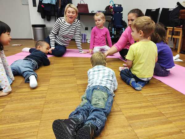 I had Sammy for much of the time, but he was also with Daddy. I was surprised that you could not tell that he had not slept; he was not cranky. He was just hungry at one point, so Randy took him to the side to give him something to eat. All the kids had participated really well today. After the class, they all got stamps for their papers and on their skin. Then it was time to put their shoes back on. Then the teacher told us that her sister-in-law knew us from church. What a small world!