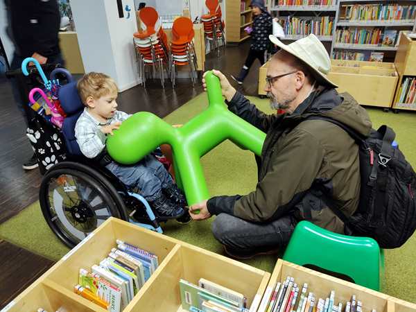 We left, stopped at the bathroom, then went downstairs to the library, where the kids got a DVD and book out each. Then we went back out into the rain to walk to the subway and go home.