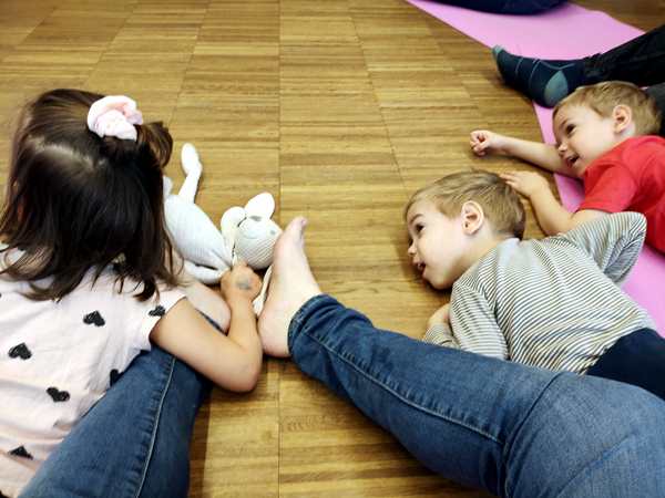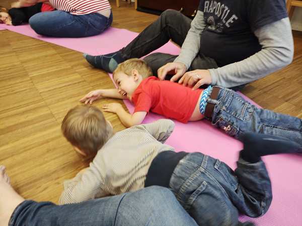 Then she had them lie down on their bellies, and we parents made movements on their backs that represented the weather, from rain to sunshine to hail. The kids were loving it, and Emmy kept saying "again". We ended up doing it three times.