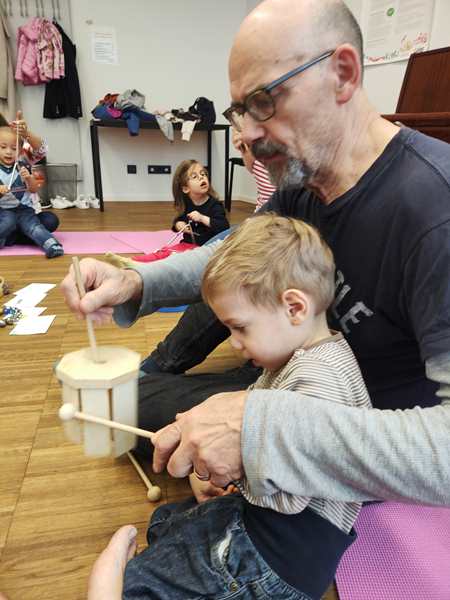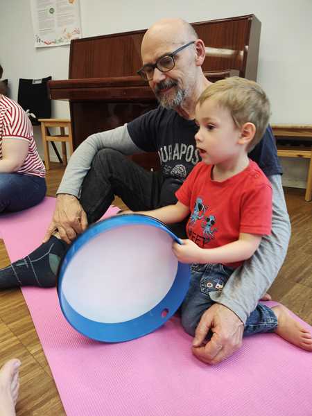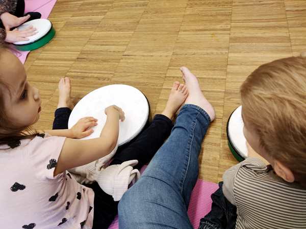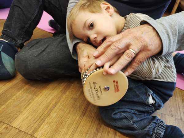 We walked to the train station and took the 4:32 train, then took the subway for one stop. We had to walk just a little bit to get to the school. Only one other kid was there, when we got there and when we started the class. It had been two weeks since the last class. The teacher gave two sound bars to the other kid, while everyone had rattles resembling fruit. Then she did the greeting song inserting the child's name. Next Emmy got the sound bars, then Tammy, then Sammy, and all three did a great job playing them. By then three more kids had arrived.
