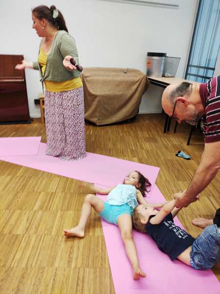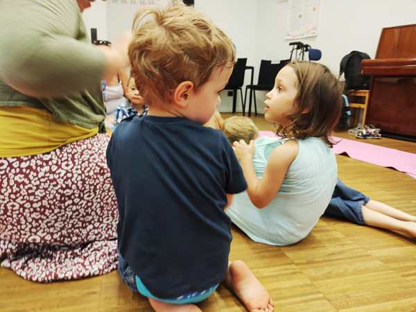 There were three other children, and the heat made the class a little harder than usual. Also, it was pretty obvious that Emmy was tired not having had a nap, as he was not participating quite a bit today. His hair was also partly wet from sweat.