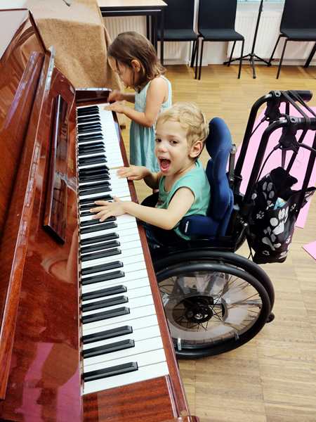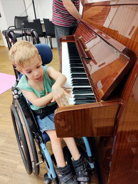 At the end, the teacher gave everyone a triangle, and everyone was to play to the song she was singing. And then the class was already over, and they each got a stamp on their paper, and always wanted one or more on their hands. We put their shoes back on, and Sammy saw the piano and wanted to play it, so I opened it up. He was really enjoying it. Then we said good-bye and left the school.
