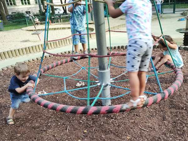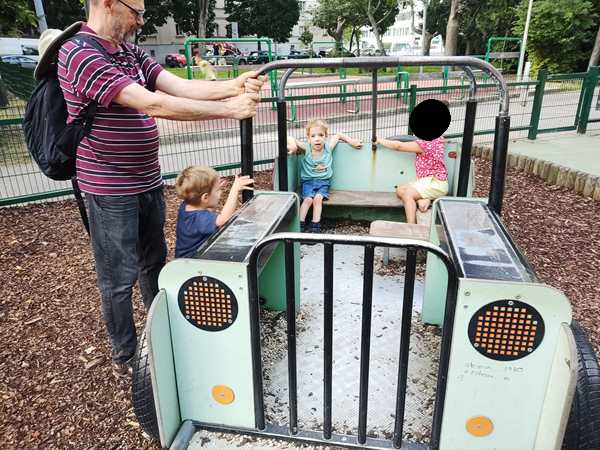 The kids wanted to go to the playground, and we agreed to go for a short time, since they've been scooped up watching stuff while Randy has been putting the bed together. We went behind the building, where the playground was. Tammy fell and scraped her knee, and Emmy also did a lot of falling today. The two of them went to the slide first, then we all went to the other side of the playground. Sammy wanted to go inside the jeep, and Daddy made it move. They all got onto the carrousel, and it was Emmy who walked in a circle pushing it. Sammy did not like it, so I took him off again. After they'd tried a few more things, we decided to go home, so Daddy could continue working on the bed.