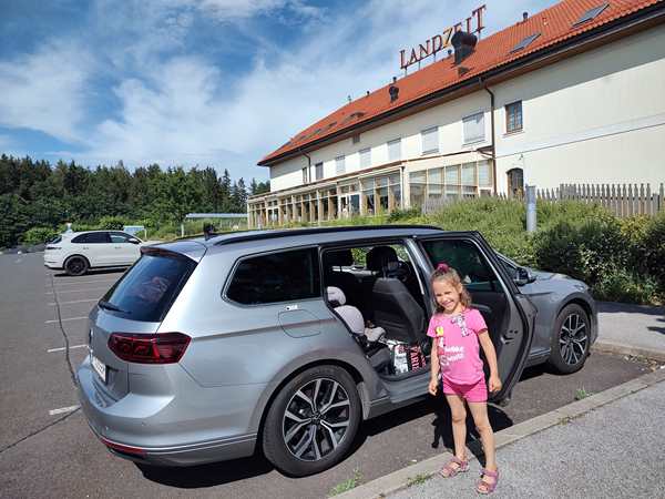We finished packing, and Randy was loading up the car. It all took longer than expected. We finally got the last few bags out of the apartment and took them to the main entrance, where Randy pulled up, coming from the other side of the house. We had been worried about how to get everything into the car given how small it was, but thank God, it worked out. Finally everything and everyone was in. It was already 2 pm, when we pulled away to start our long trip to the other end of Austria.