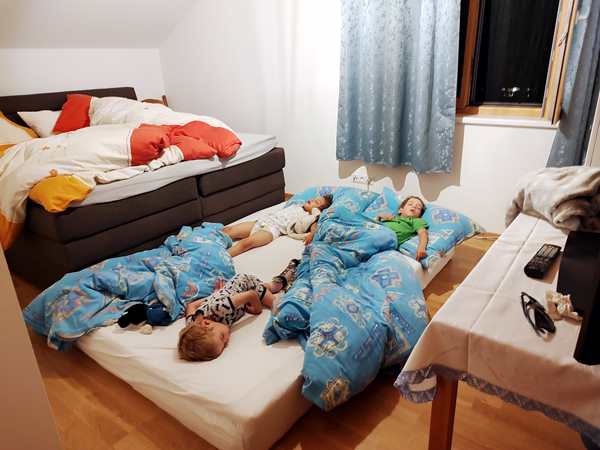 And then we had finally made it to our Airbnb in Lustenau. A young lady greeted us and showed us our apartment. She was really nice. Then Randy unloaded the car, while I was getting the kids ready for bed. All Tammy wanted to do was to sleep. Emmy and Sammy were in really high spirits and having fun together. They looked like they wanted to stay up, and Emmy stayed awake for quite some time, even after Sammy had fallen asleep. I had moved the mattress from the other room to our room, putting it next to our bed, as they wanted to be with us, and I took their picture once they were all sleeping.