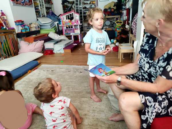 In the afternoon Grandma came who the kids hadn't seen in a very long time. Sammy and I had about half an hour alone with her before Randy returned with the other two. Then Randy went shopping, finally having an opportunity to do so, while the kids were enjoying Grandma, as was I. I happened to not have any students that afternoon. She read to the kids, and she played Hide & seek with them. She never stays longer than two hours, though. As she was leaving, Randy returned from the store.