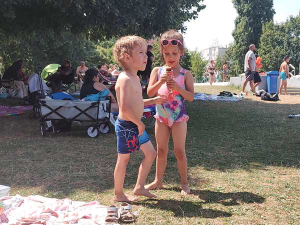 The other kids had been in the water since arrinving and were all coming out just as we were coming and going in. I had Sammy and was having fun with him, while the other two were having fun by themselves. Randy didn't come in. After a while they left the water to rejoin the other kids. When they got icecream, they wanted some too, and Randy took them to buy some.