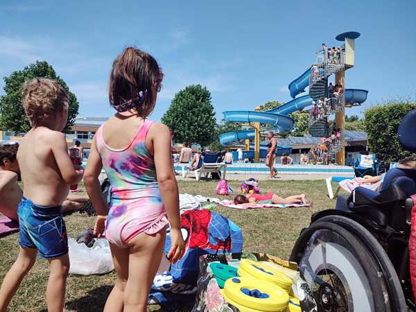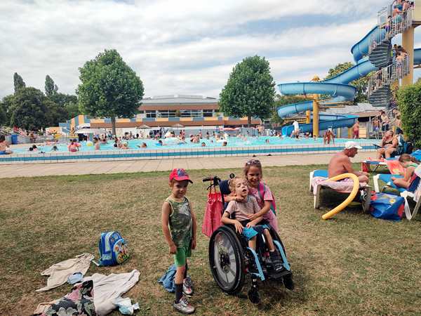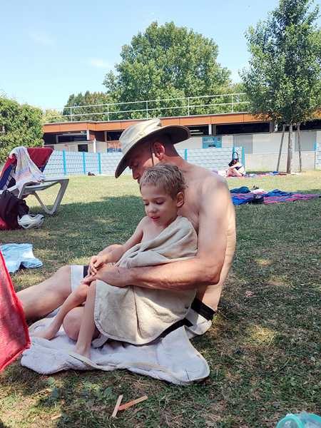 And then they opened the water slide. Randy went up with Emmy and they slid down together. Tammy, Sammy and I were in the water to be there, when they came down. Emmy wanted to go again, and this time it was me who went up the tower with him. It was a long but rather slow slide. Tammy didn't want to go down.