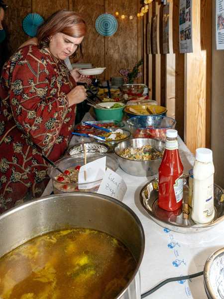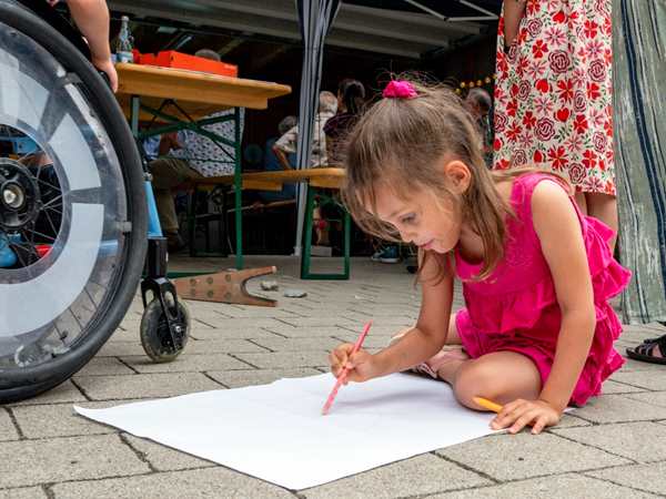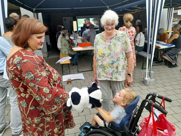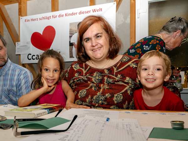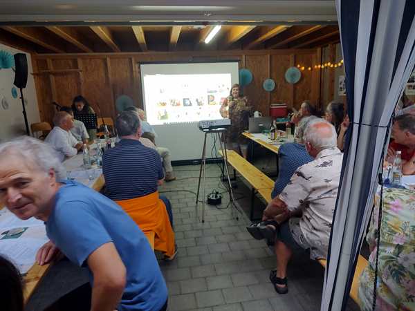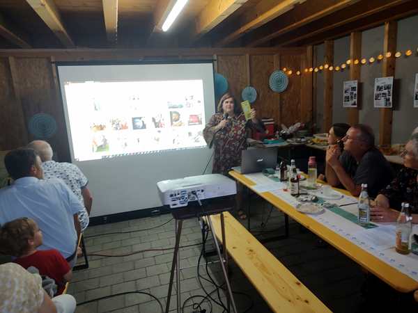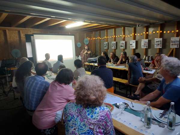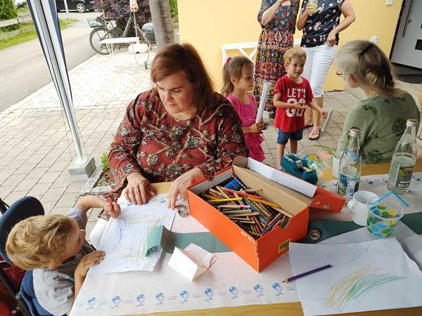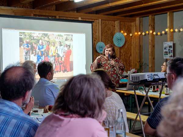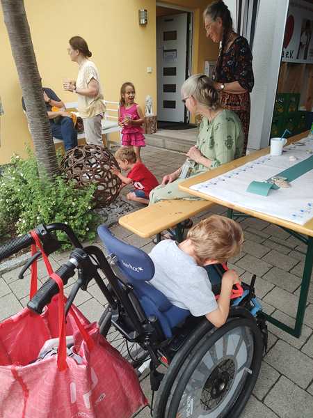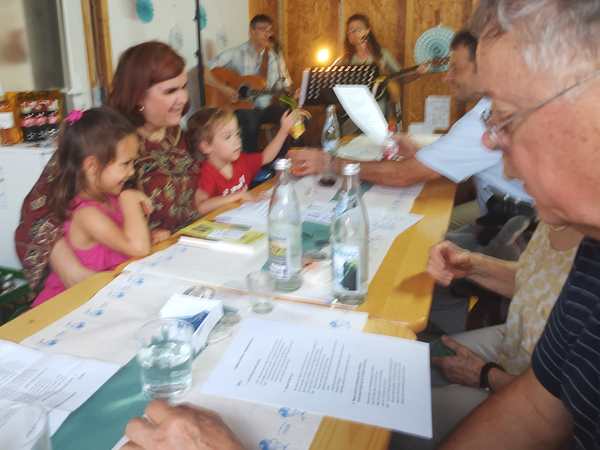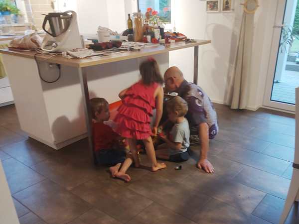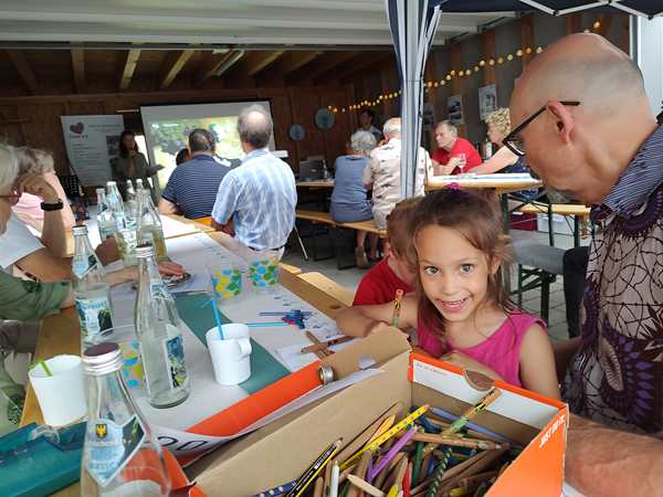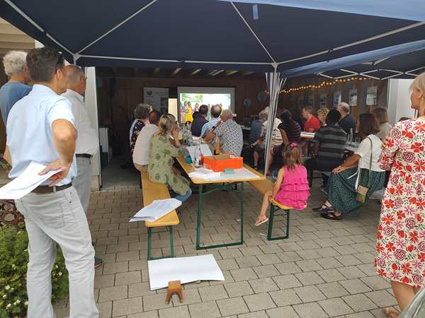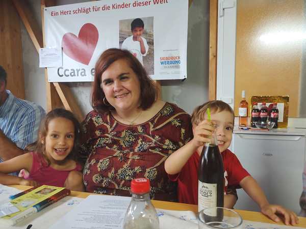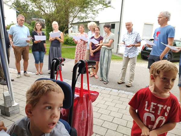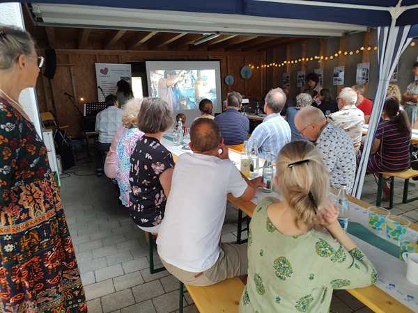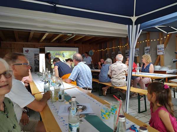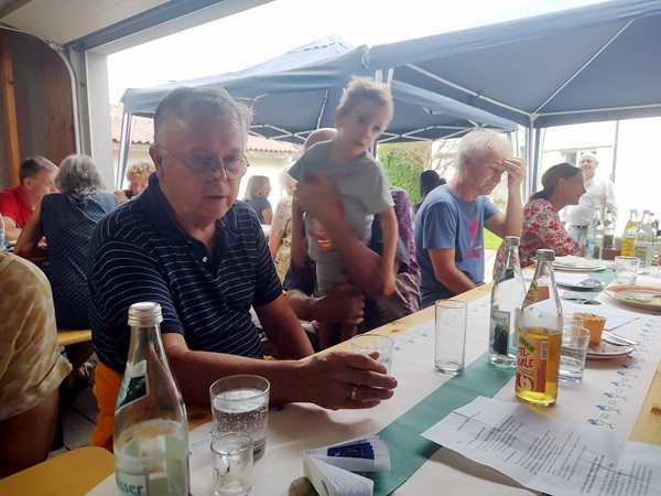 We had leftovers from yesterday that we ate for lunch. At 3:30 pm we got ready to leave the house, and at 4 pm we left. We had a 50-minute drive ahead of us, into Germany, the way we'd come. At 5 pm we pulled up at our friends' house. They told us where to park, and we drove there, then walked back to their house. They had set up a tent and tables and benches in their garage for the summer party we were invited to. Our friends there have an organisation helping children and have been working with us for a very long time. They asked us to come to their big yearly event so all their donors could meet us in person, and that was the reason why we were doing this trip at this time.