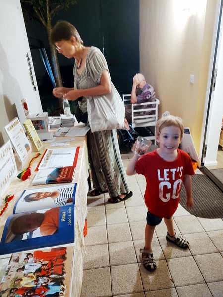 Then they showed a longer video they had put together to present their projects in India. I was surprised at how interested Tammy and Emmy were. They were watching attentively. Sammy was tired and getting cranky. A lady finally walked up to him and gave him a cuddly cow as a gift. That helped for a while. When Emmy saw the cow, he said to the lady that he wanted one as well. She was a neighbor and ended up going to her house to get an animal for Emmy as well (a donkey). Only Tammy was disappointed that she had not received anything.