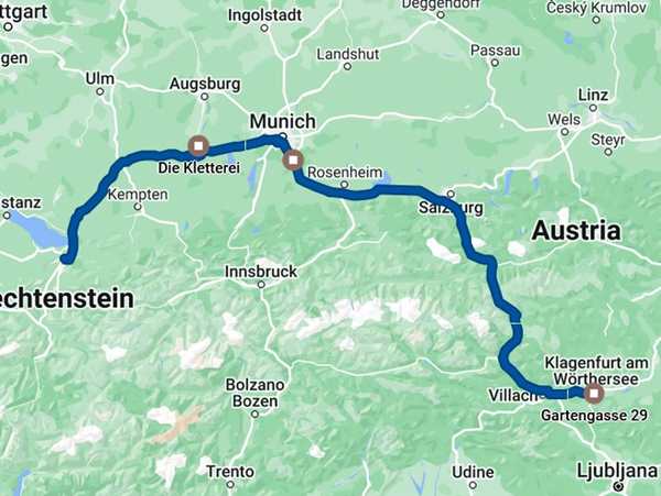 Because the tunnel from Vorarlberg to Tyrol was closed, we had to go through Germany again, which was a huge detour. It was about four hours to Salzburg, going through Munich, and then two hours south to Klagenfurt, so nearly as long and far as what we did the first day. In addition, we did not have internet in the car while in Germany, which was nearly 4 hours, which made Sammy cry as he wanted to listen to his children's songs that he needs the internet for. And so he cried and cried, when there was no internet, but never went to sleep. The other two have stuff on their tablets they can do without internet, but Sammy was tired of those same old songs.