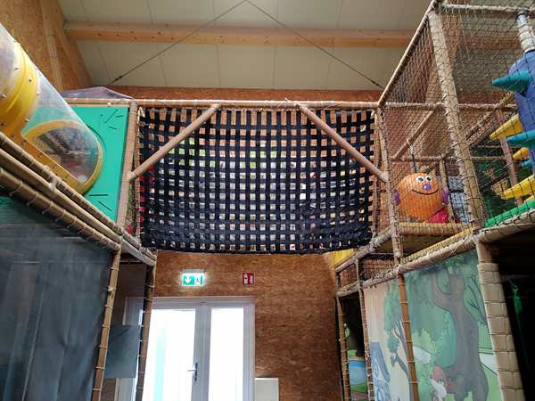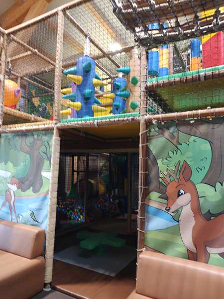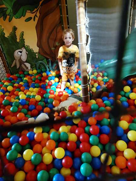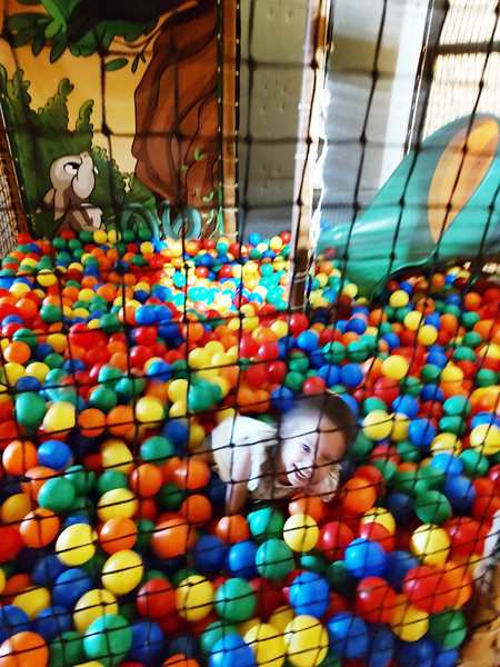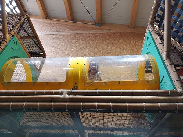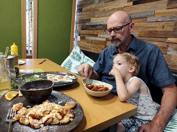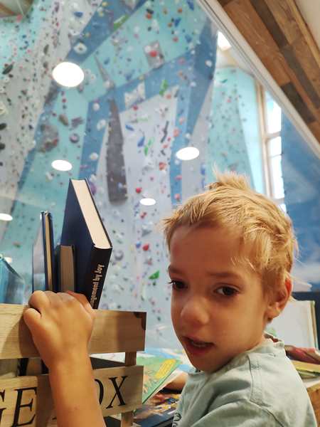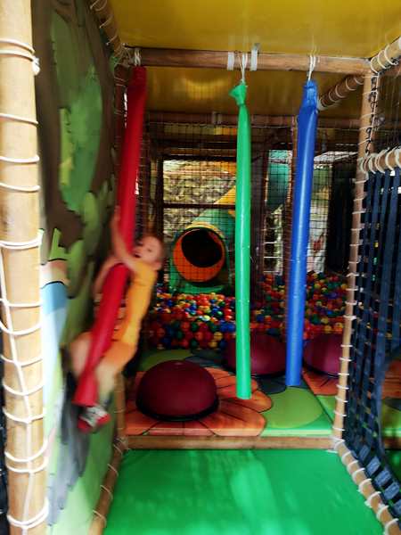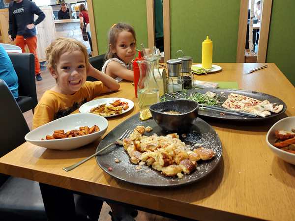 Instead we continued driving to the restaurant I had found online. People liked the typically German food, and I saw a picture of a playground. We parked there just after noon and went inside. The restaurant looked nice, especially the nook we found, where they had all kinds of children's books. We sat down and ordered. We had an amazing view of a really high climbing hall that only a big window separated us from, and then some people were actually climbing all the way to the top, which the kids enjoyed watching. The guy had told us that there was also an indoor playground, and so I took the kids there. Again, I was absolutely amazed at how big and amazing it was! Randy then went there with Sammy as well, while I stayed at the table to wait for the food and then called them once it had arrived. It had not taken very long, and it looked amazing. We had a local speciality that was different than I had expected, plus chicken strips and sweet potato fries and regular fries, plus an Austrian dessert. Everybody enjoyed the meal, but they were eager to return to the playground. We paid and all went there.