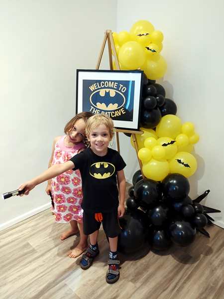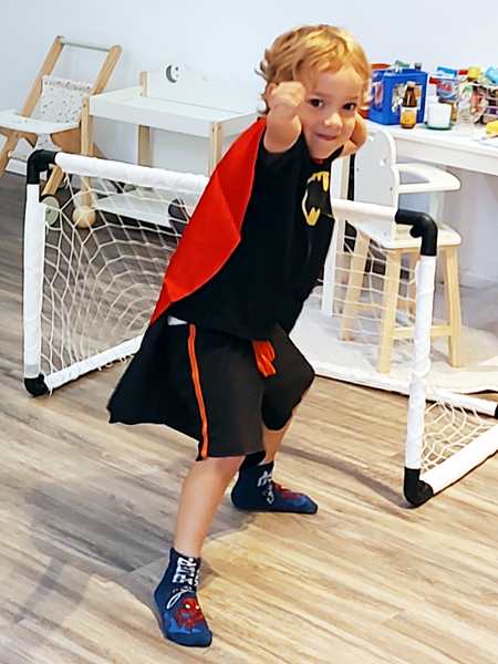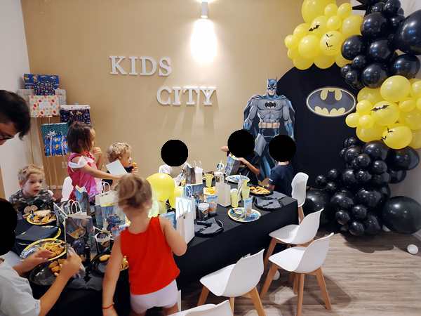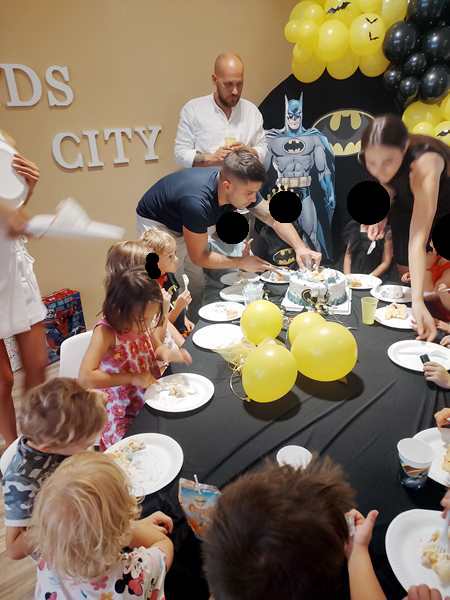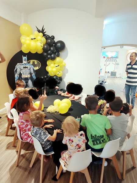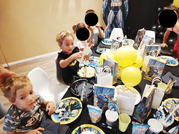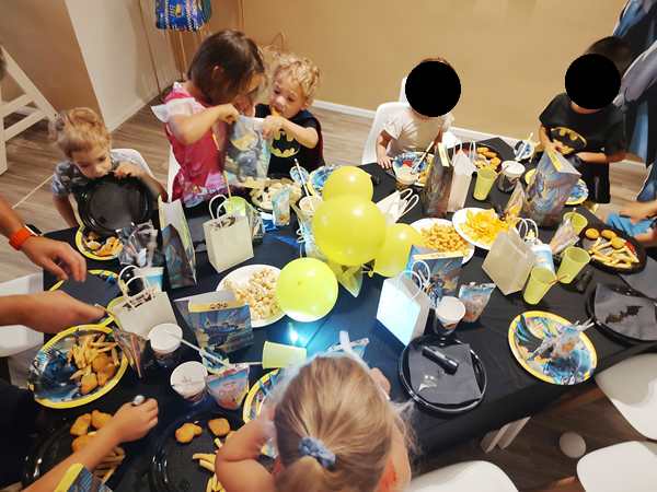 Emmy played with the boys for a while, including soccer. At one point everyone sat down at the table. The theme was Batman, so there were Batman plates, napkins and party favor bags for every child. The kids were curious to look inside them and found candy, tattooes and a little flashlight that was the most popular with the kids. They then had some chicken nuggets and fries to eat before running off to play some more.