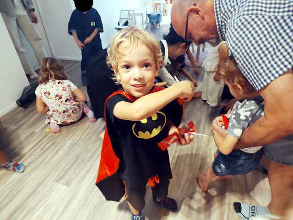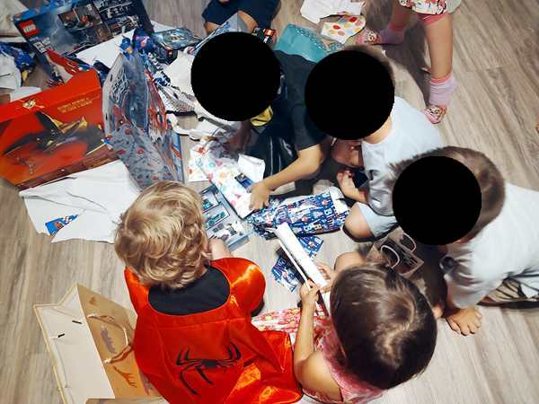 There was one more item on the agenda. The birthday kid hadn't even opened his gifts yet! They put them all on the ground in the middle of the room, and he opened them one after another. Emmy's gift was one of the last ones. Emmy had even done a drawing for his friend! And he watched and commented as his friend opened the gifts - a Batman watch and stickers. Emmy told me that his was definitely the best gift of them all.