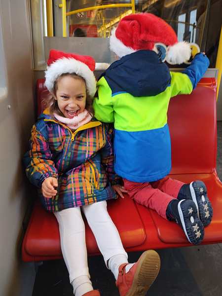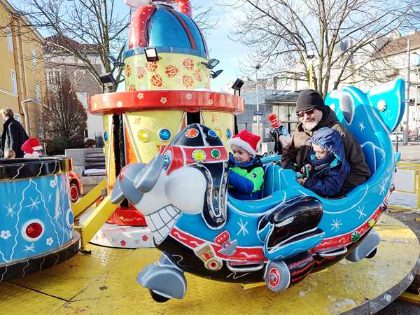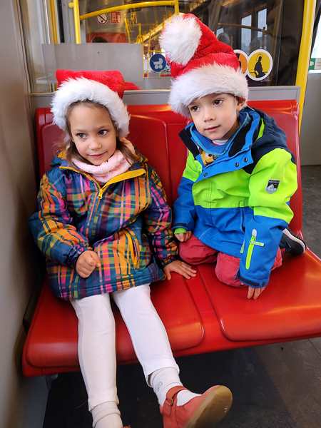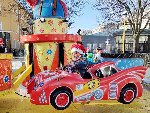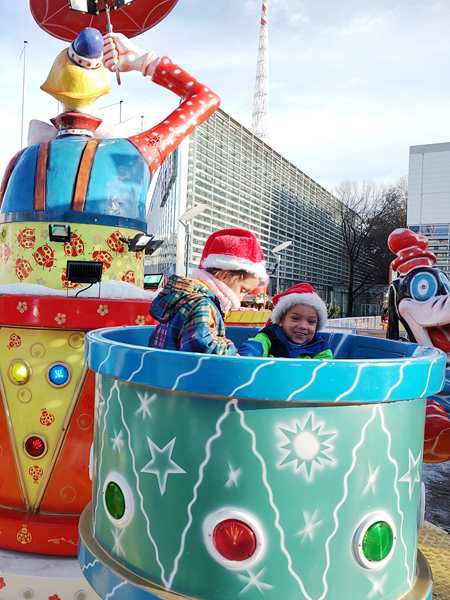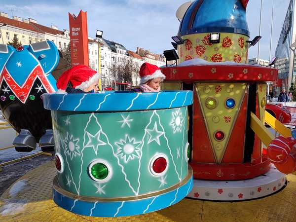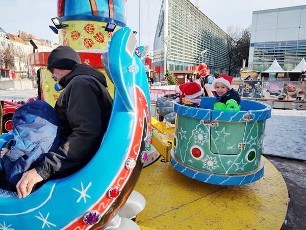 We walked back to the subway and got on an old train, which made Sammy cry. Thankfully he had his new toy that helped him get over the disappointment. We got off after a few stops to go have lunch at McDonald's. We had a good time there, then left to walk back to the subway. There's a Christmas market right there, but it's only open later in the afternoon. However, people use the little ice-skating rink, and then the kids saw that the caroussel was moving. They were really excited and wanted to ride it. So we walked over to it, through the melting snow and the resulting water everywhere. Unfortunately all the seats in the caroussel also had water on them. Randy didn't want to do it, but the kids were so excited that I couldn't say know. You could get 4 rides for 10€, and I asked the guy whether we could take the 4th ride with us for another time. He said he didn't have anything to give us for another time and then said he'd let all three ride twice. Wow! He gave us two rides for free! Randy had to climb into the little plane with Sammy, so he could sit there safely. Tammy and Emmy went into the spinning cup for the first ride, then Emmy sat in the front of the plane, where Daddy and Sammy were, and Tammy was driving another vehicle. They were laughing and giggling and having so much fun!