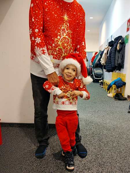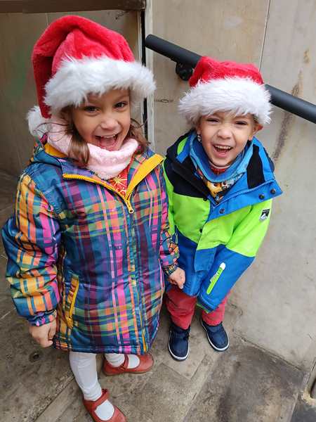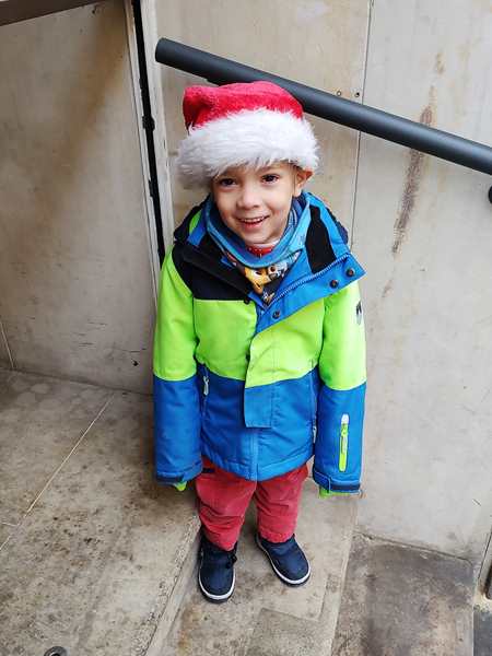Day 1567. This morning I had my alarm set for 8 am, but Sammy was up early, as usual, and the others got up not long after. We did all the advent calendars, then got ready to leave the house at 9:15. I got the tops of our Christmas pj's out that we all put on to have matching T-shirts. We were going to a Christmas party after all. The kids also wanted to wear their Christmas hats, and so all three of them put them then. Then we left the house early.